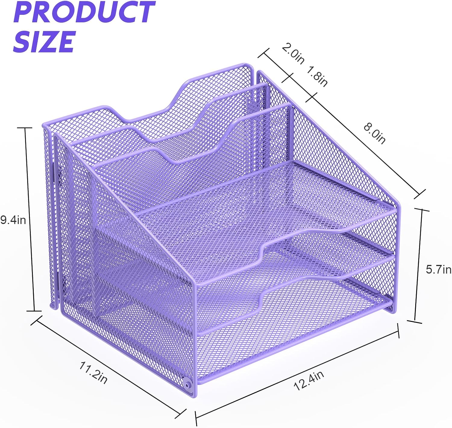 Samstar Purple Desk File Organizer, Mesh Letter File Folder Holder with 3 Paper Trays and 2 Vertical Upright Section, for Office Supplies, Desk Accessories & Workspace, Purple