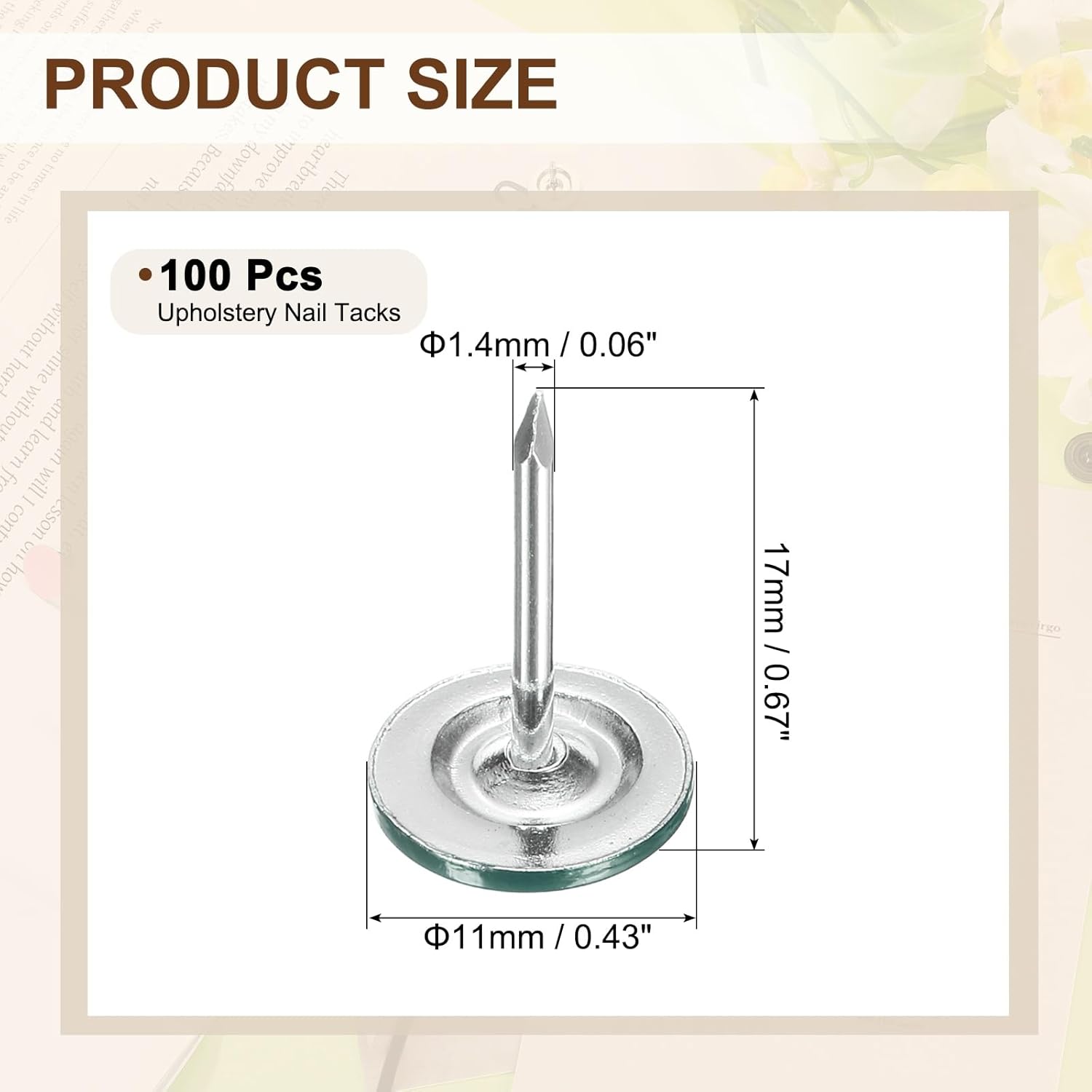 - [Size & Quantity] - The package comes with 100pcs decorative upholstery tacks. Sufficient quantity to meet your different daily needs. The overall size of upholstery nails is about 11mm x 17mm/0.43-inch x 0.67-inch(D*H)