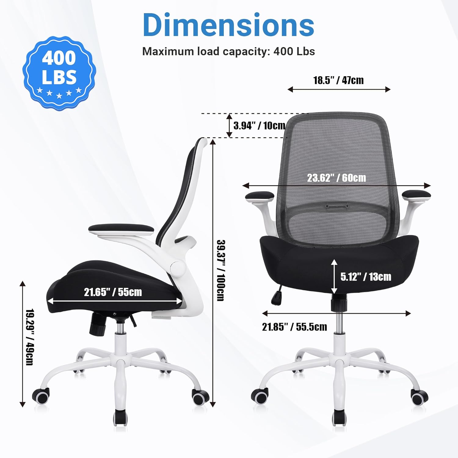 HYLONE Heavy Duty Office Chair, 5" Thickened Seat Ergonomic Desk Chair with Adjustable Armrests, Home Office Computer Chairs for Long Hours Mesh Executive Chair(White Base & Black)