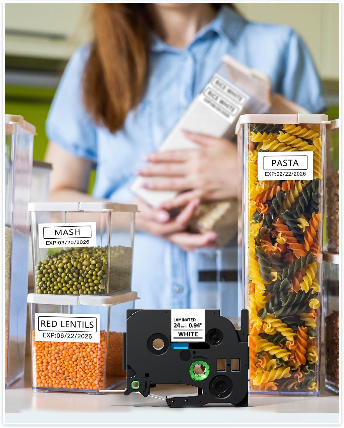- Durable & Weather-withstand: Our premium TZe 24mm 0.94 laminated white tape features a tough laminate coating. These TZe-251 labels withstand water, abrasion, extreme temperatures, and sunlight fading, ensuring crisp, long-lasting identification indoors and outdoors. Ideal for industrial bins, warehouse shelves, and outdoor equipment tags