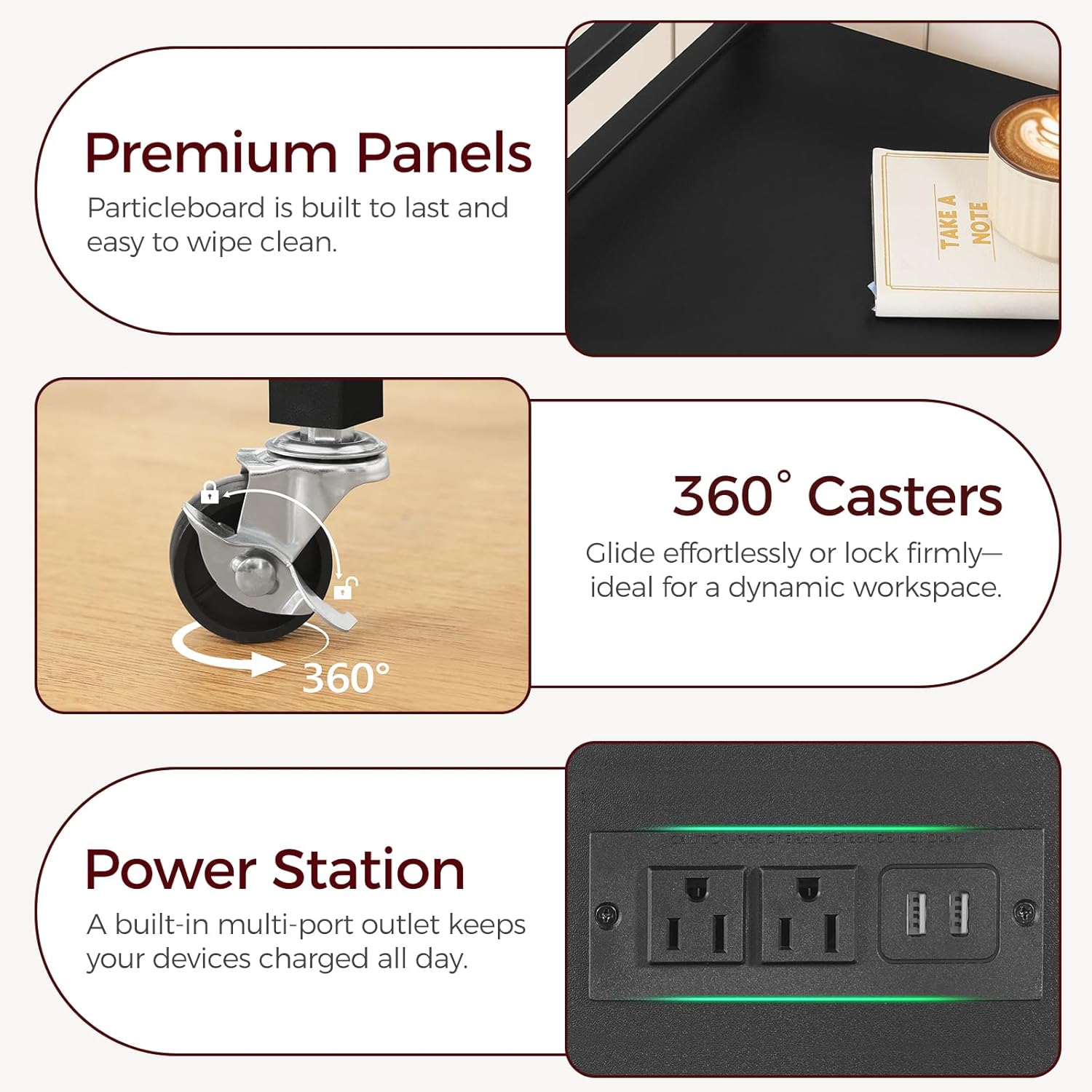 - Printer Table with Charging Station: This printer cabinet includes a utility power strip, offering 2 AC and 2 USB ports. It meets the charging needs of various electronic devices like printers, scanners, phones, and watches, facilitating both work and leisure