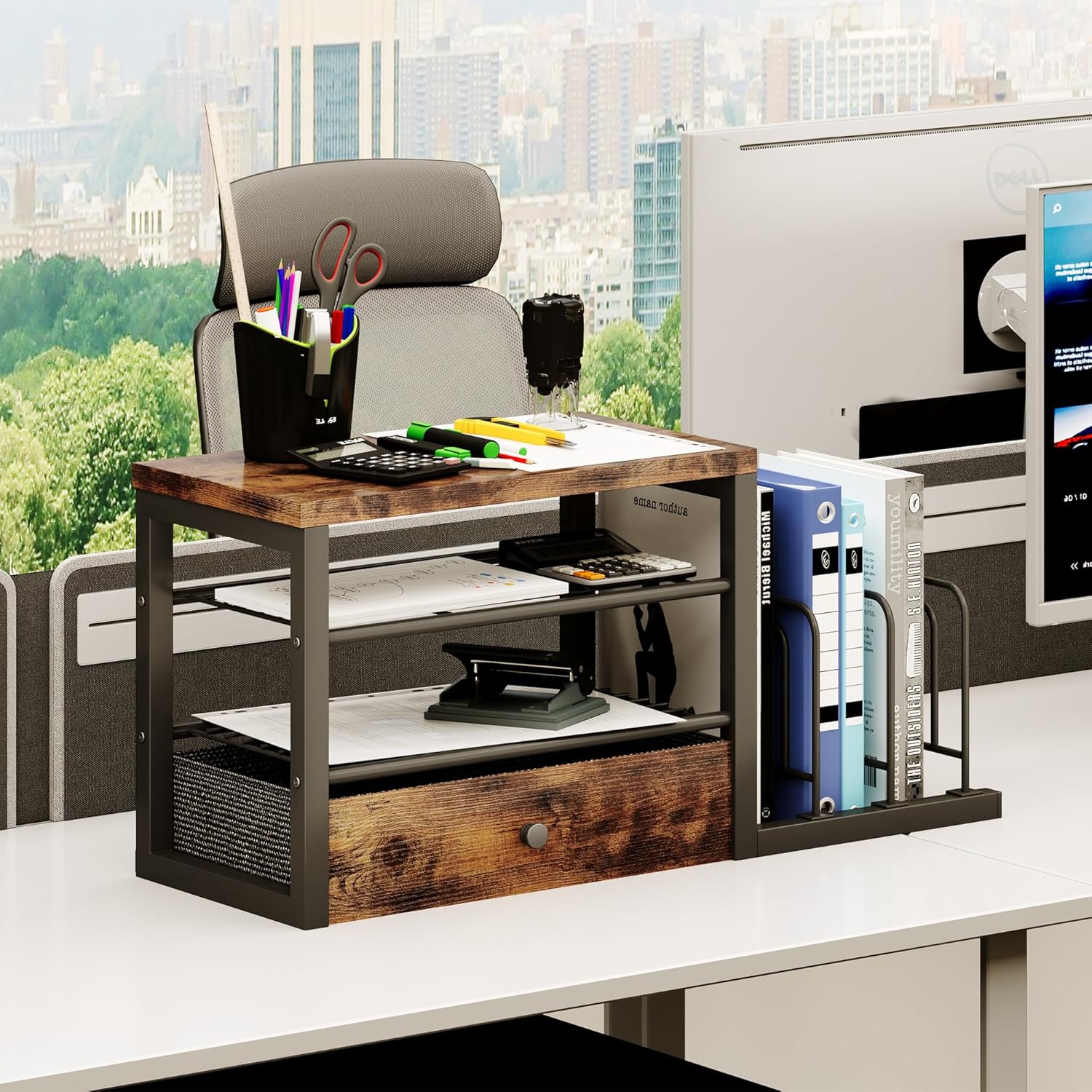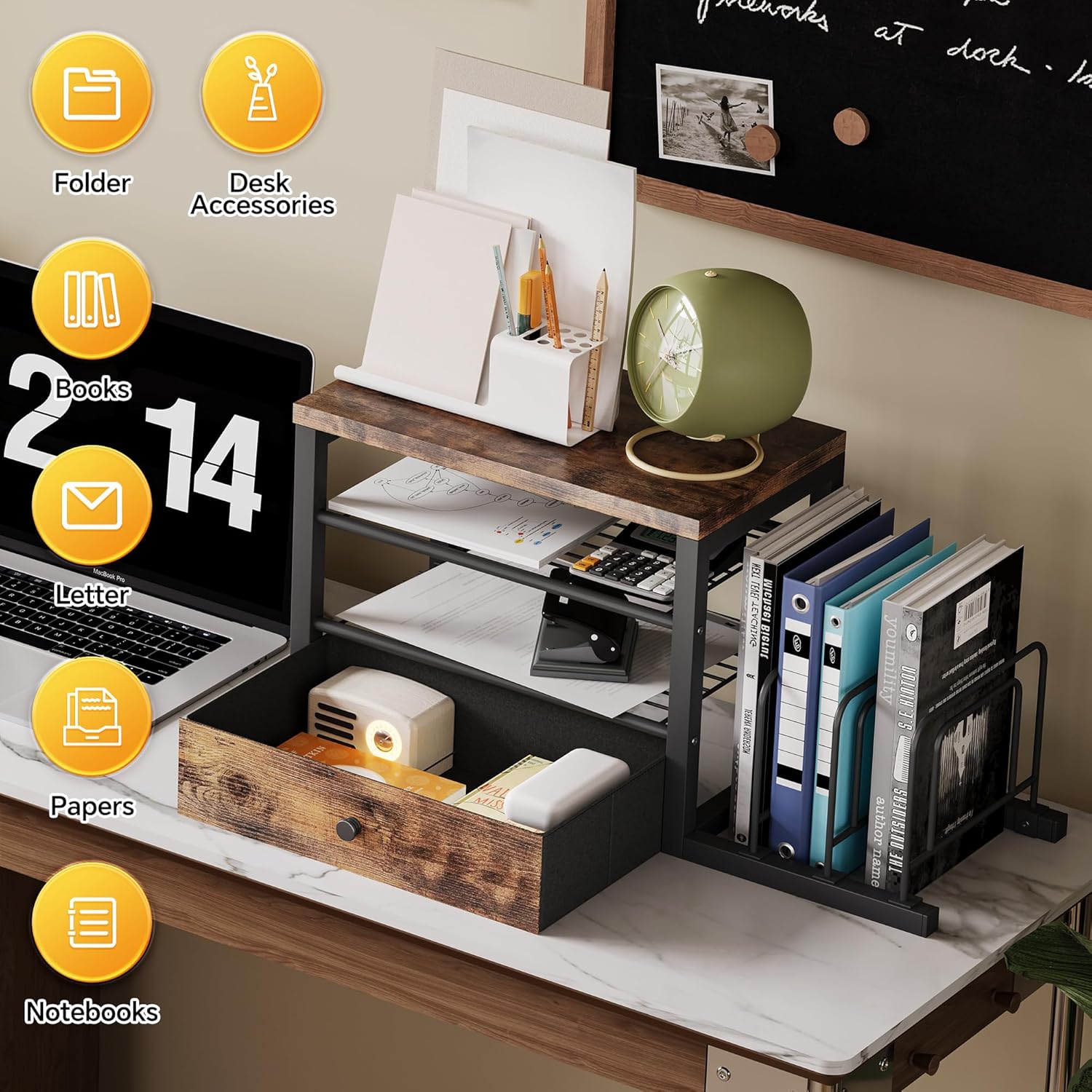 - ✅ ALL-IN-ONE DESK ORGANIZATION – Features compartments for books, notebooks & supplies + drawer (fits pens, clips, tools) & vertical file holder for folders/mail.