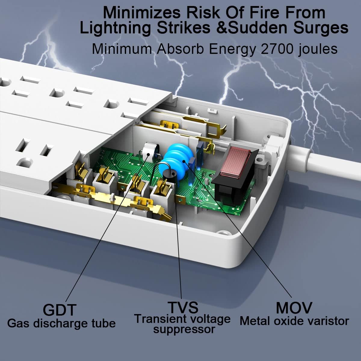 - 【12 AC Surge Protector Outlets】- The 3 level complementary Surge Protector Circuit which composed of TVS (transient voltage suppressor), MOV (metal oxide varistor), GDT (gas discharge tube), with minimum 2700 Joules energy absorbing capacity, could protect your devices much more quickly and reliably than other brand's 1 level MOV Surge Protection Circuits.