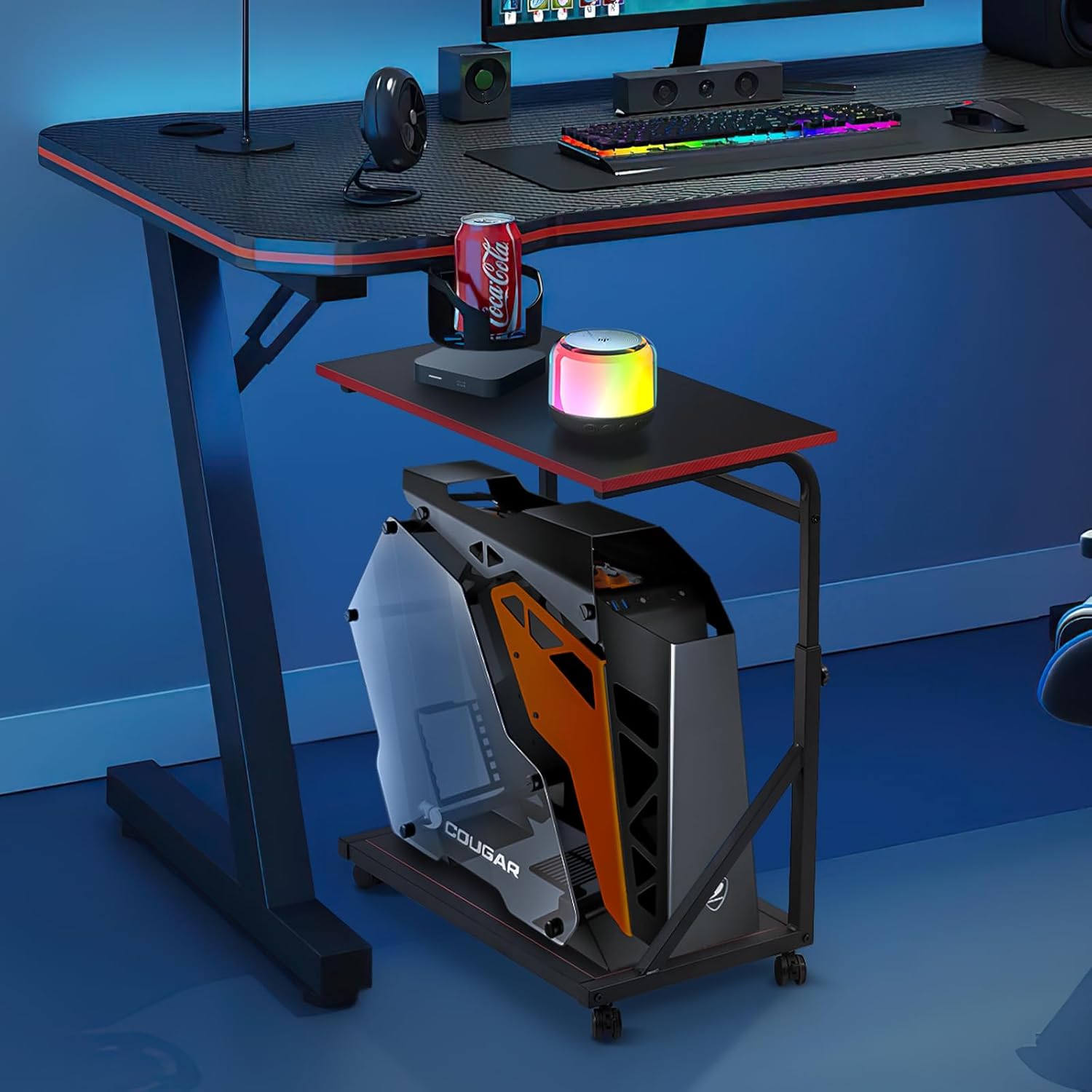 Ergonomic Height Adjustable Computer Tower Stand, 2-Tier CPU Holder Cart Under Desk, PC Floor Stand for Office Gaming Black and RED