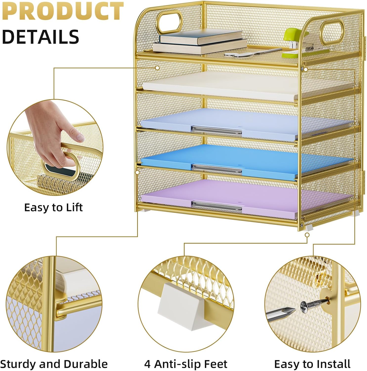 Marbrasse Paper Organizer Letter Tray, 5 Tier Mesh File Organizer with Handle, Paper Sorter Desk Organizer for Home Office Supplies - Gold
