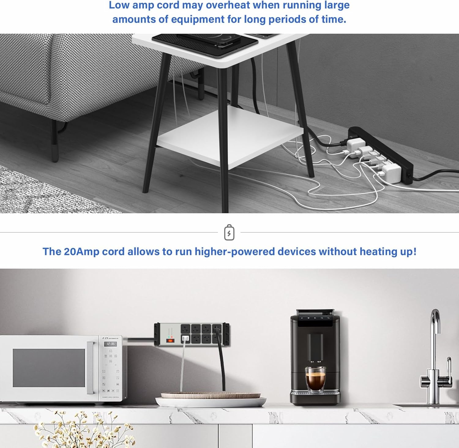 - 10FT Heavy duty extension cord 12 awg, can perfect for carrying 15Amp, 1875w of full power. And running a lot of equipment for long periods of time and without overheating.