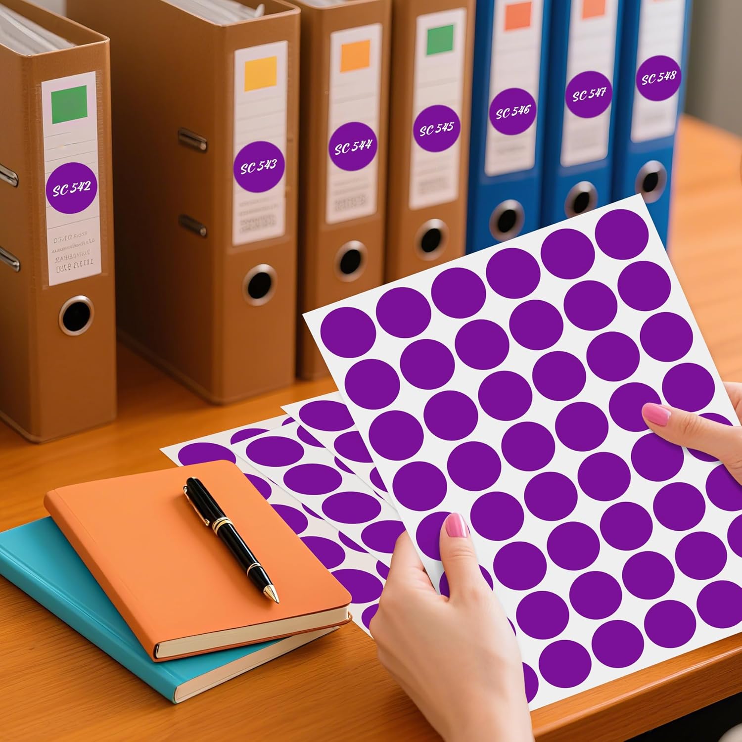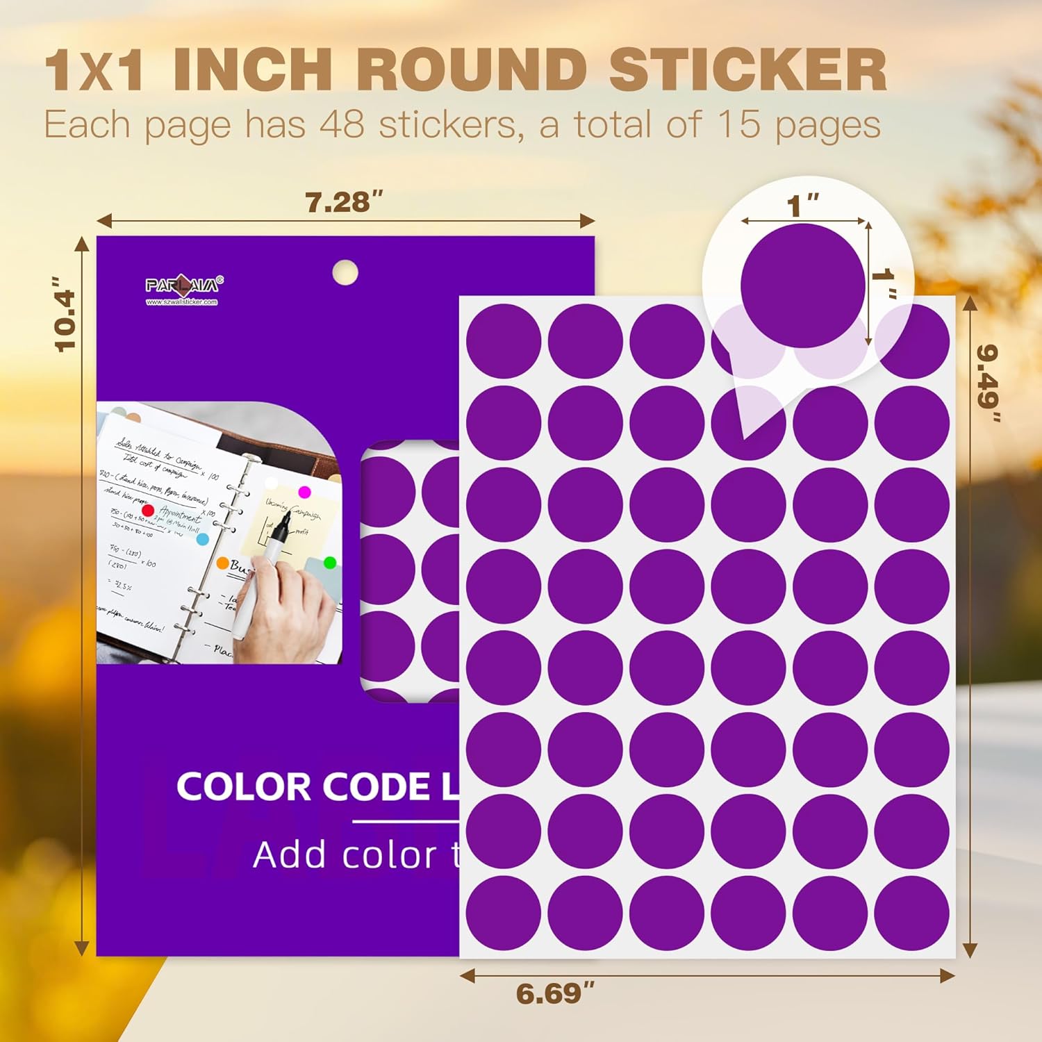 - Cardboard package: 15 sheets 1 inch purple dot stickers, total 720 pcs round color-code circle label, package size 266mm*185mm