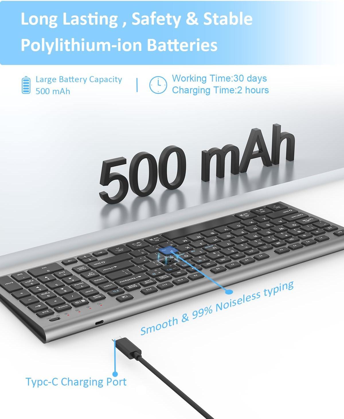 - 【Environmental Protection and Energy Saving】:Never worry about running out of power again! Our high-capacity long-lasting rechargeable battery. The battery capacity is about twice that of most standard wireless keyboards.No more tossing out disposable batteries; it’s eco-friendly and cost-saving. Type C charging port, charging takes about 1.5 hours, with a usage time to about 60 days (depending on usage habits). The smart low-battery reminder ensures you’re always prepared, whether you’re working on a cross-country flight or a long study session.