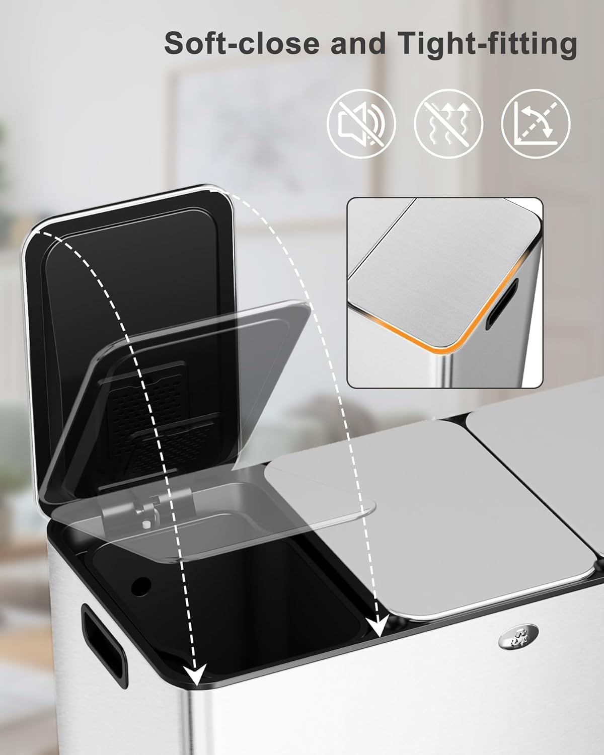 - 【Odor Seal】: The three compartment trash can adopt innovative lid design effectively seals in odors, prevents pests from entering, and keeps the area clean and fresh, enhancing the overall hygiene of your space.