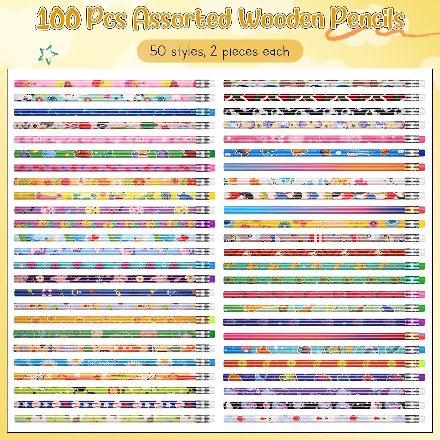 - Sufficient Quantity: the assorted pencil set contains 100 pcs #2 HB pencils with 50 styles of designs, 2 pencils for each, providing sufficient quantity and rich style choices, which can not only meet personalized aesthetic needs, but also be easy to share with friends