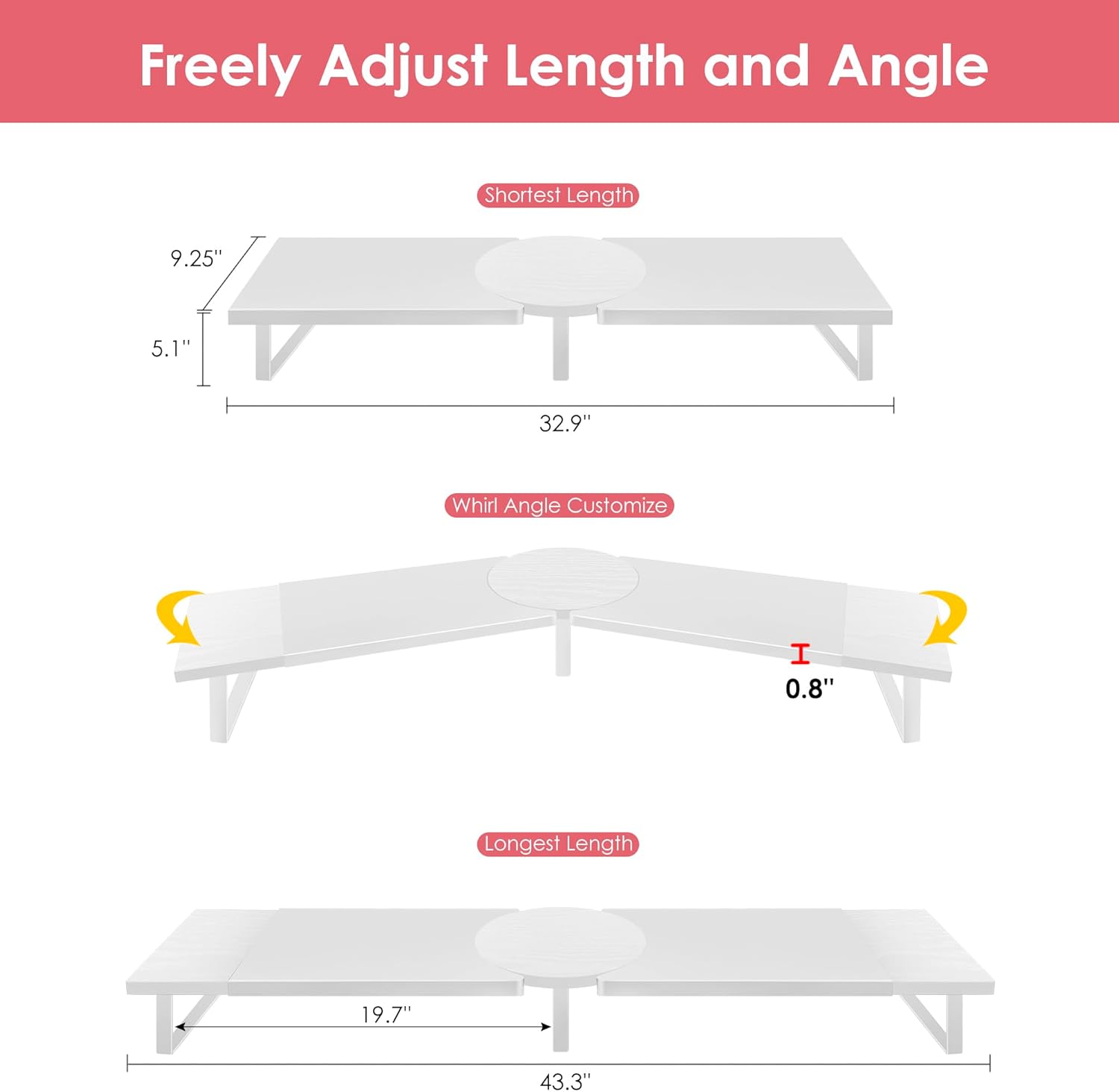 - 【Adjustable Length & Angle】You could adjust the length of large computer stand for desktop monitor from 32 to 55 inch, which could be adjustable to accommodate 1-2 monitors/laptops to meet your office needs. Wiht the circular turntable in the middle, you could move monitor riser for 2 monitors at any angle to customize a comfortable position.