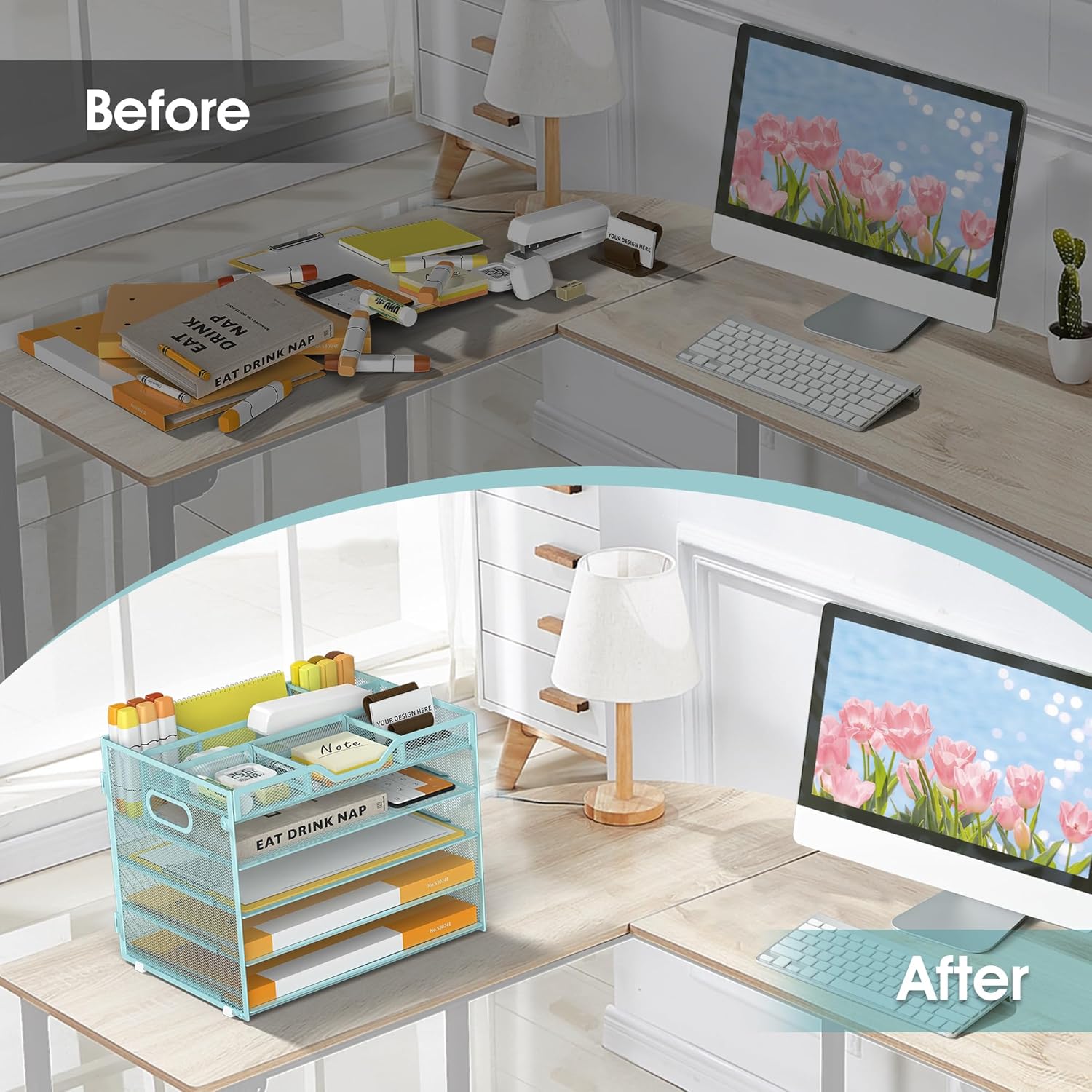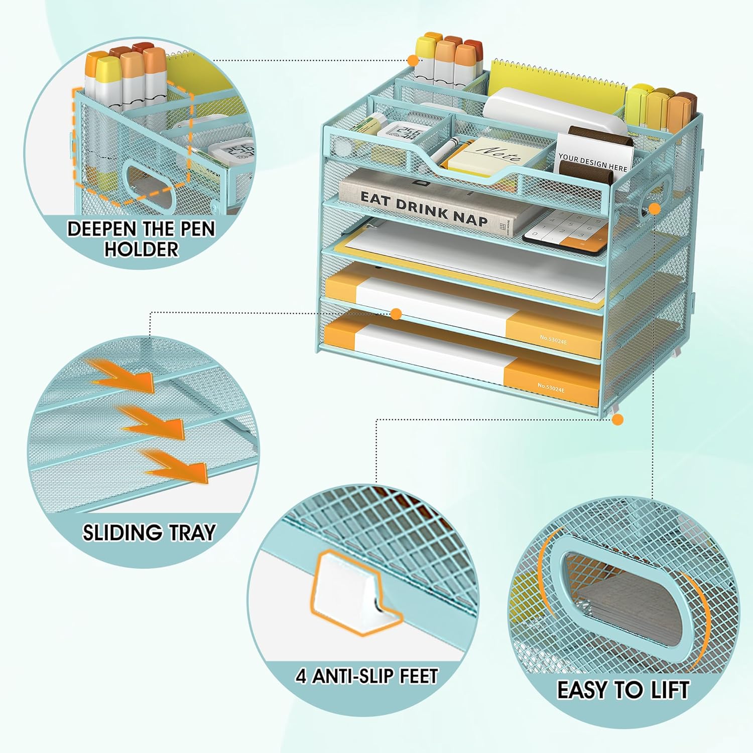 - Quality Materials and Superb Craftsmanship-Featuring a lightweight and durable metal mesh construction with a sturdy frame and powder-coated finish that ensures the desktop file manager won't bend or break when holding large quantities of paper, files and books, the file manager has a smooth finish that complements the office's work decor
