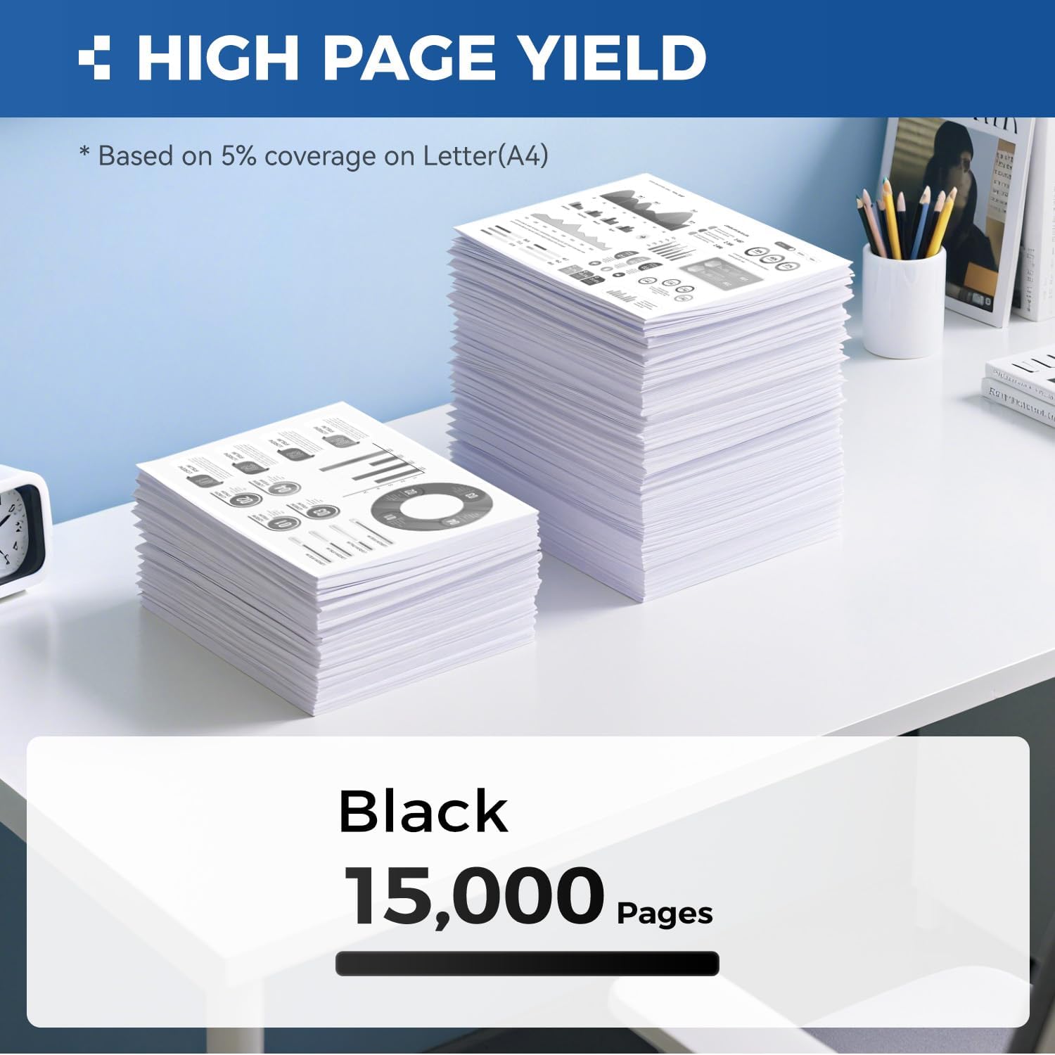- Page Yield: Up to Black is 15,000 pages per black cartridge (Letter/A4, at 5% Coverage).