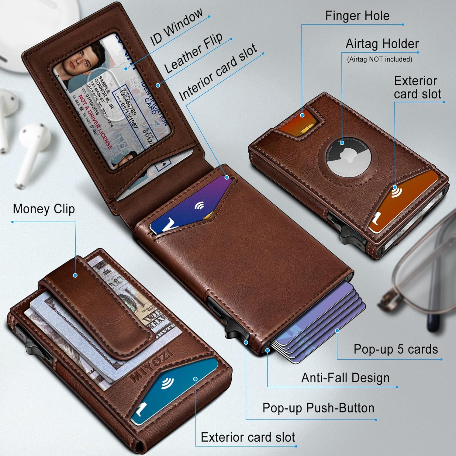 - AMPLE STORAGE--Easy for 9 cards and holds Airtag,Slim wallet with refined layout to fit in front pocket,the money clip with Leather wrapped for carry cash,5 cards in the aluminum case with pop-up access,4 cards in the leather shell;