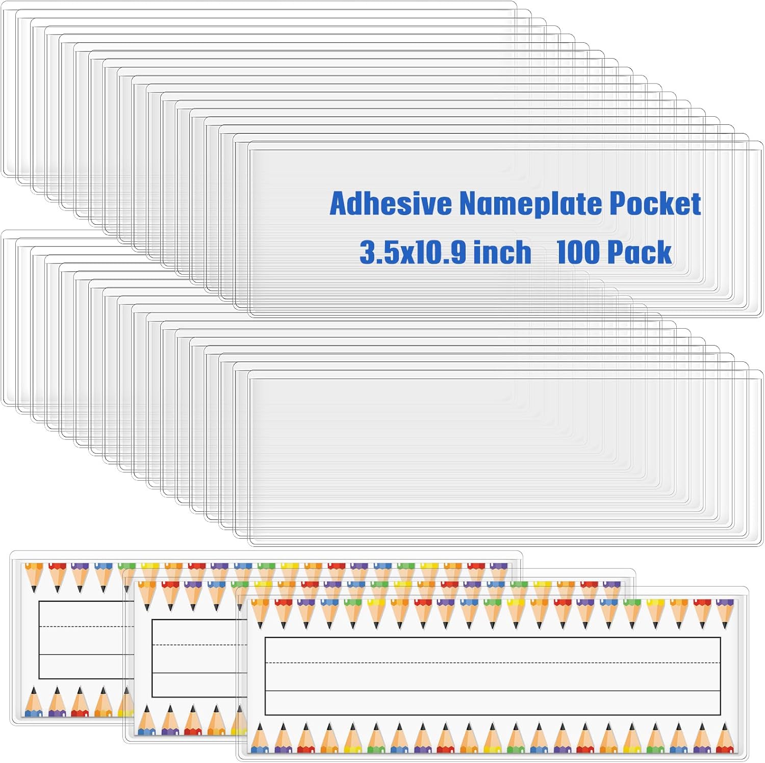 Jeyiour 100 Pcs Label Holders Adhesive Nameplate Pockets Storage Bin Labels Index Card Holder Shelf Plastic Peel Stick for Classroom Supermarket Bookshelf Library Student Box Drawer (3.5 x 10.9 Inch)