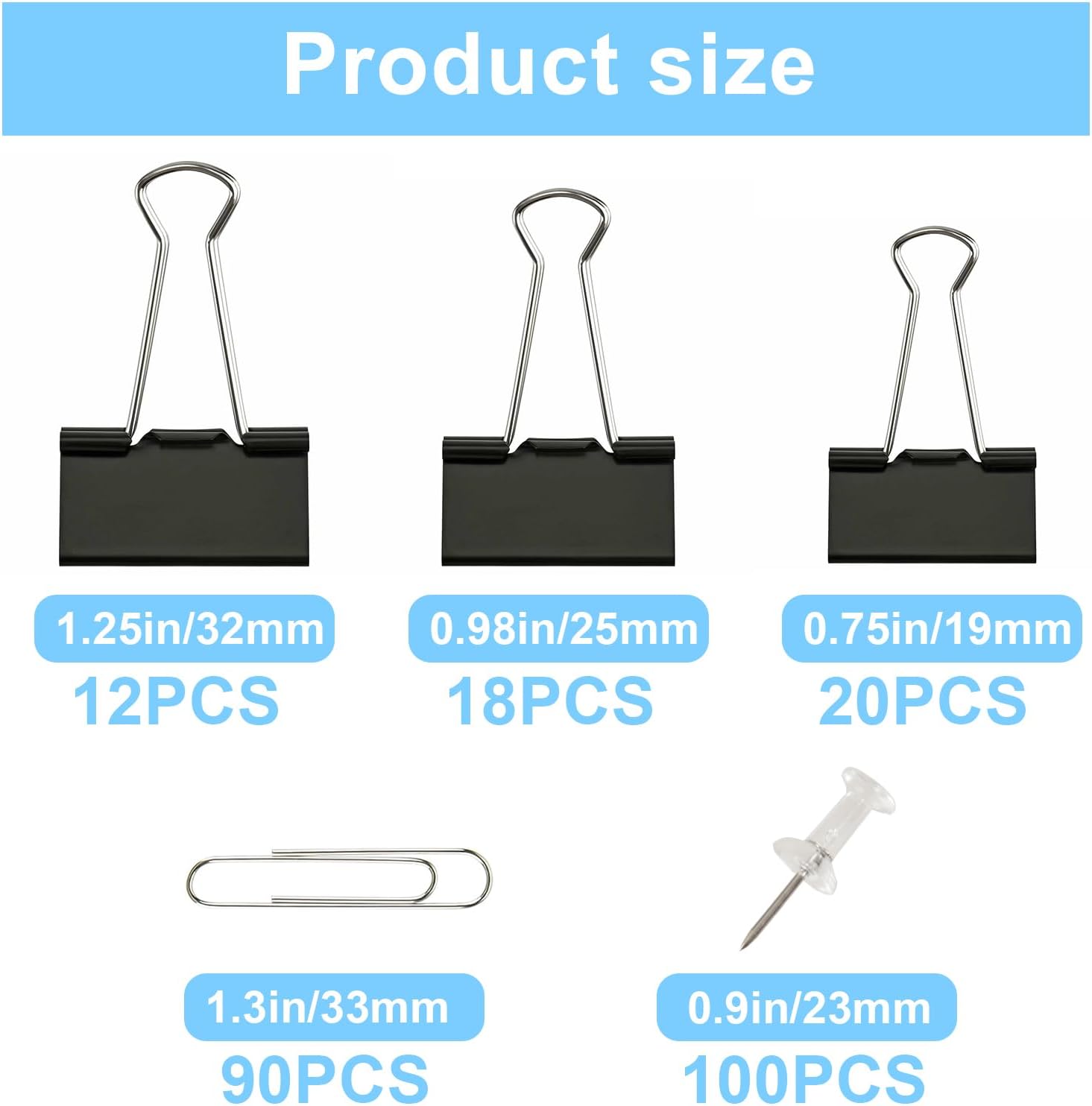 - 【Paper Clips, Binder Clips, Push Pins Set】: Black and Silver office supplies of assorted sizes, 20 small binder clips(0.75”), 18 medium binder clips(1”) , 12 Large binder clips(1.26”), 90 medium silver paper clips (1.3"), 100 medium transparent push pins (0.9") , perfect for your daily needs in life and work