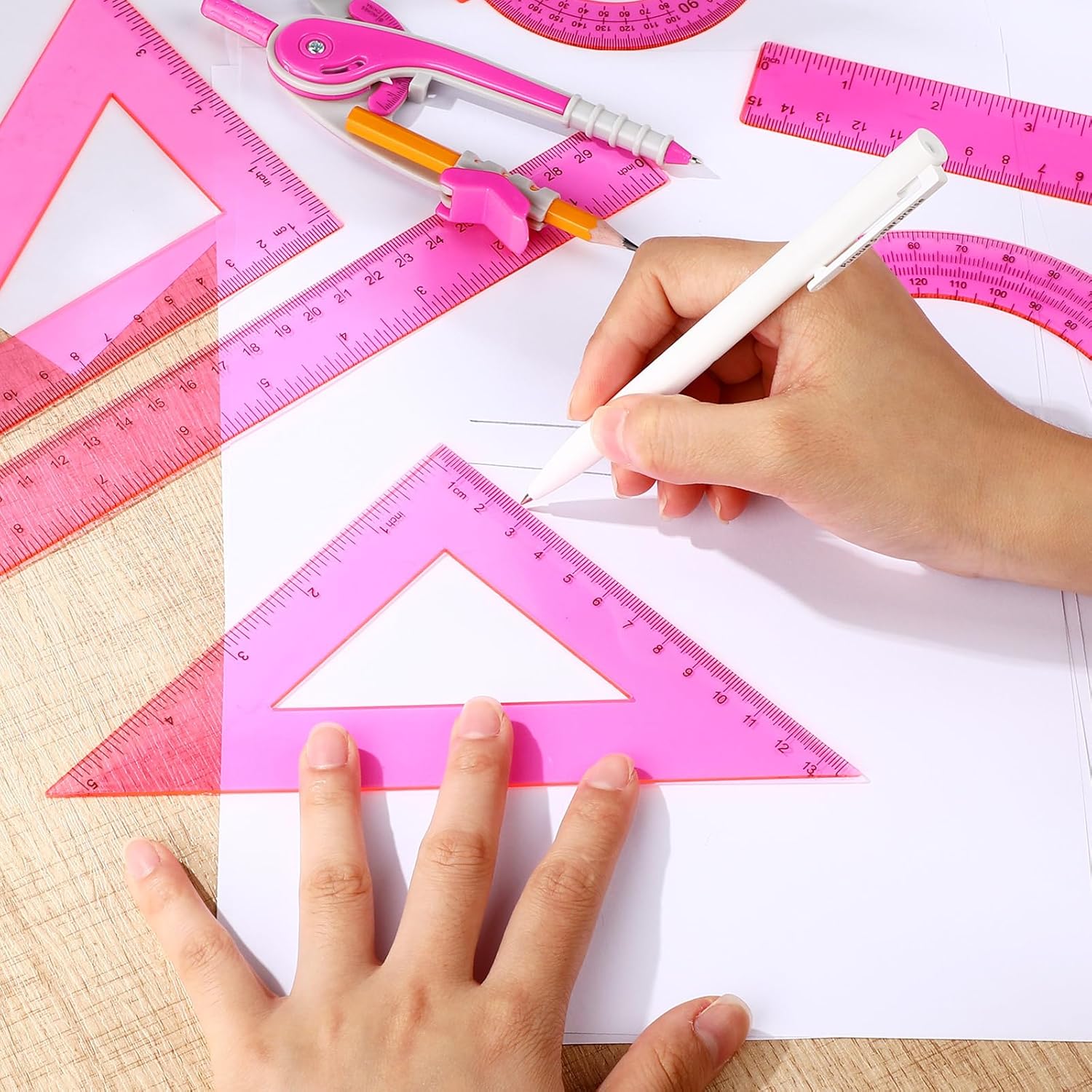 Zonon 1 Set Plastic Geometry Math Set 7 Pcs Includes 6'' / 4 '' Protractor, Drawing Compass, 45/60 Degree Triangle Rulers, 12'' / 6'' Math Ruler Transparent for Office Supplies(Pink)