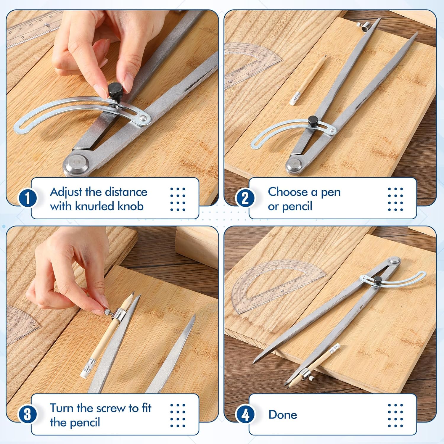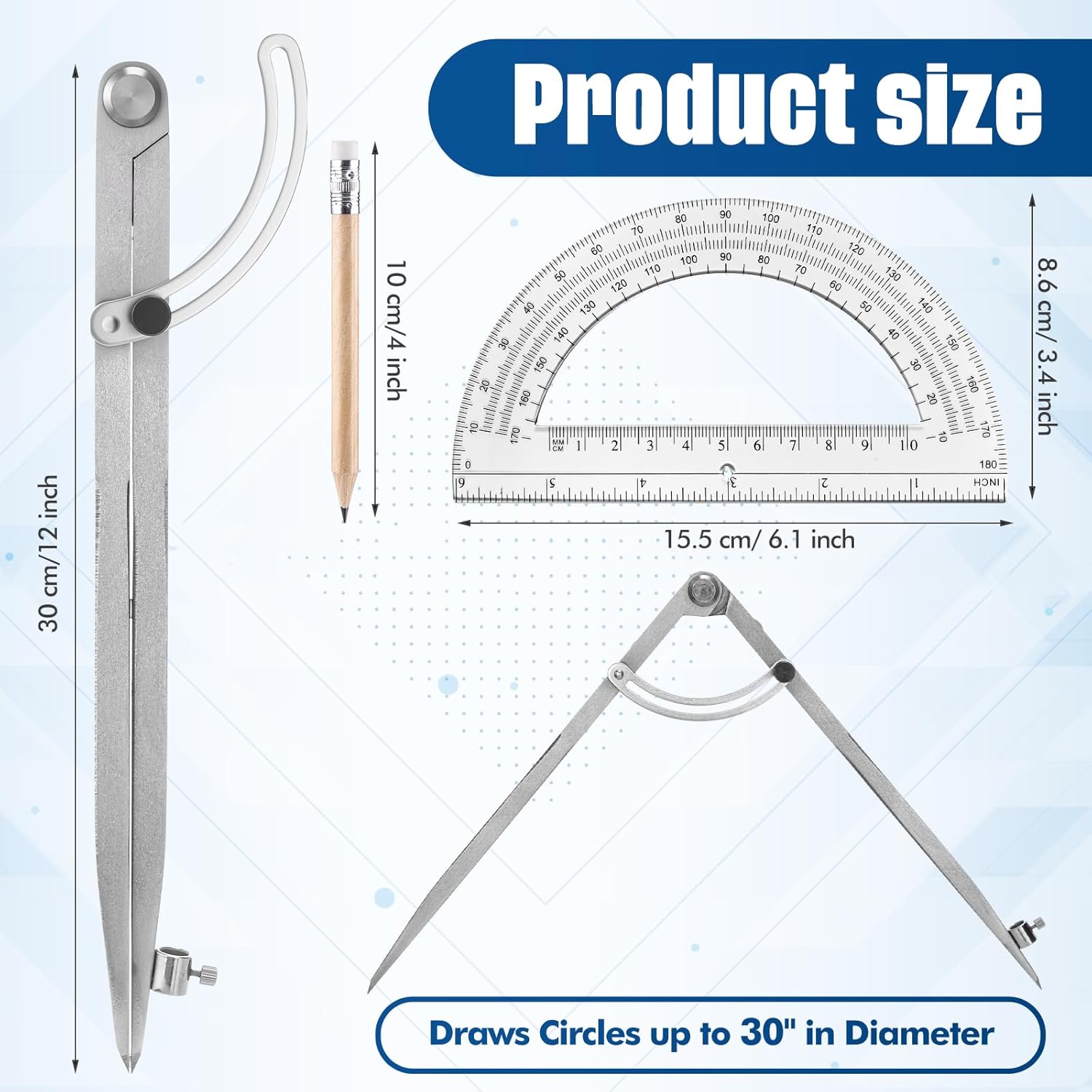 - Three Piece Geometry Set: you will receive a 12 inches large professional compass, a 6 inches protractor and a pencil, suitable for math, geometry, art, drawing and painting, suitable for most circle drawing needs