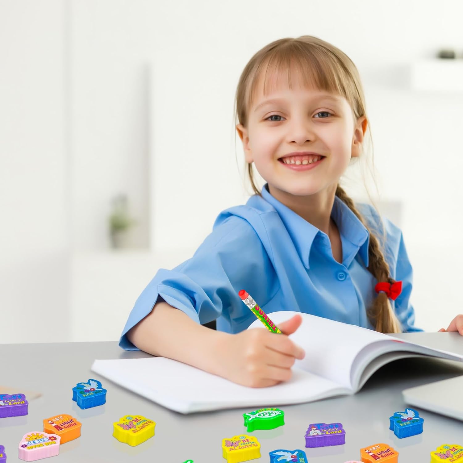 - 60PCS Bulk:Each package includes 60 Bible verse pencil erasers in a variety of inspirational designs. With ample quantity, this set is perfect for classroom supplies, Sunday school rewards, party favors, or church events
