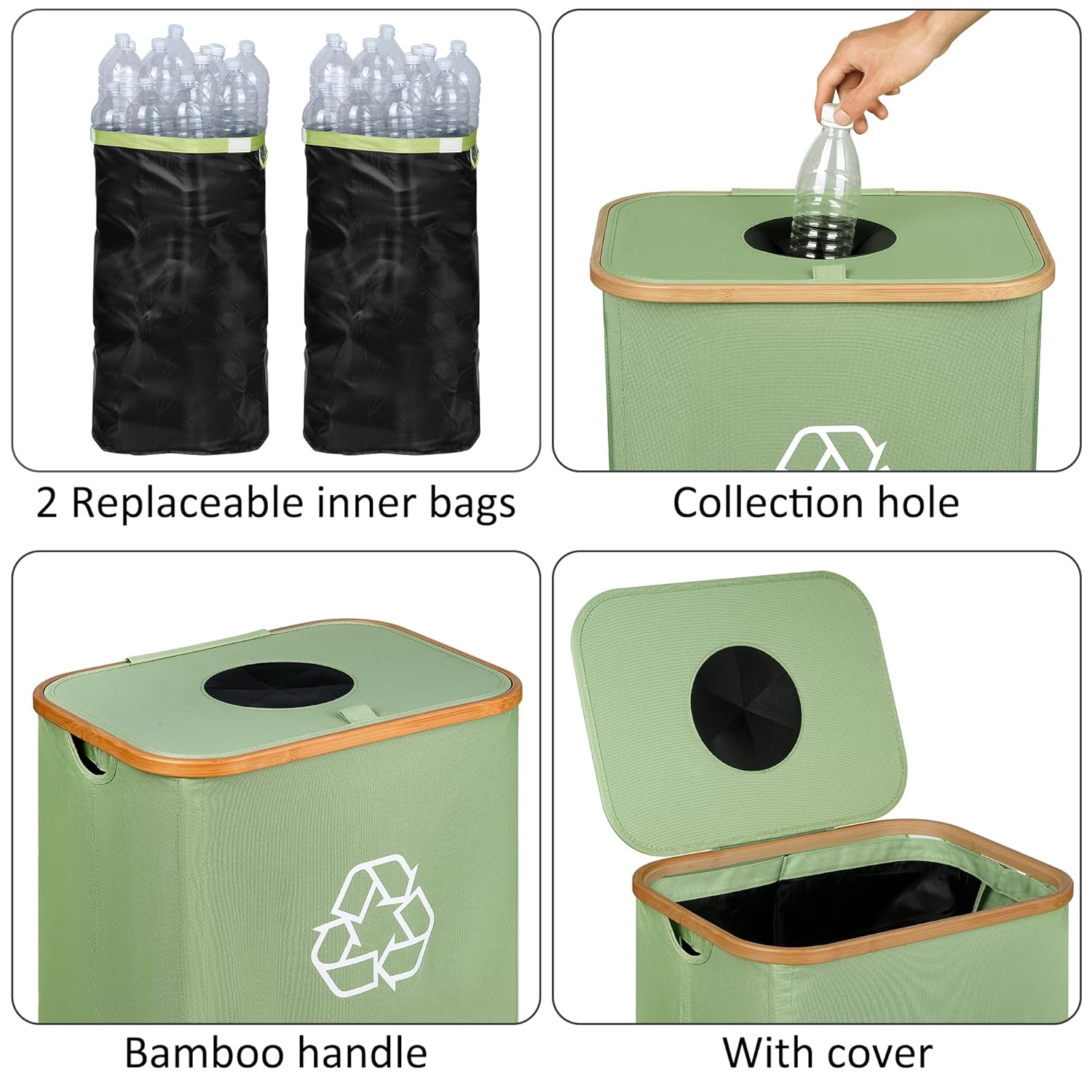 - ♻【Simplified Storage Tasks】The smooth bamboo handle ensures a comfortable grip without causing any discomfort to your hands. The lid of the basket helps suppress odors and keep the environment clean. This recycling trash can has ample storage space, facilitating efficient organization of bottles and keeping your home or dormitory tidy.