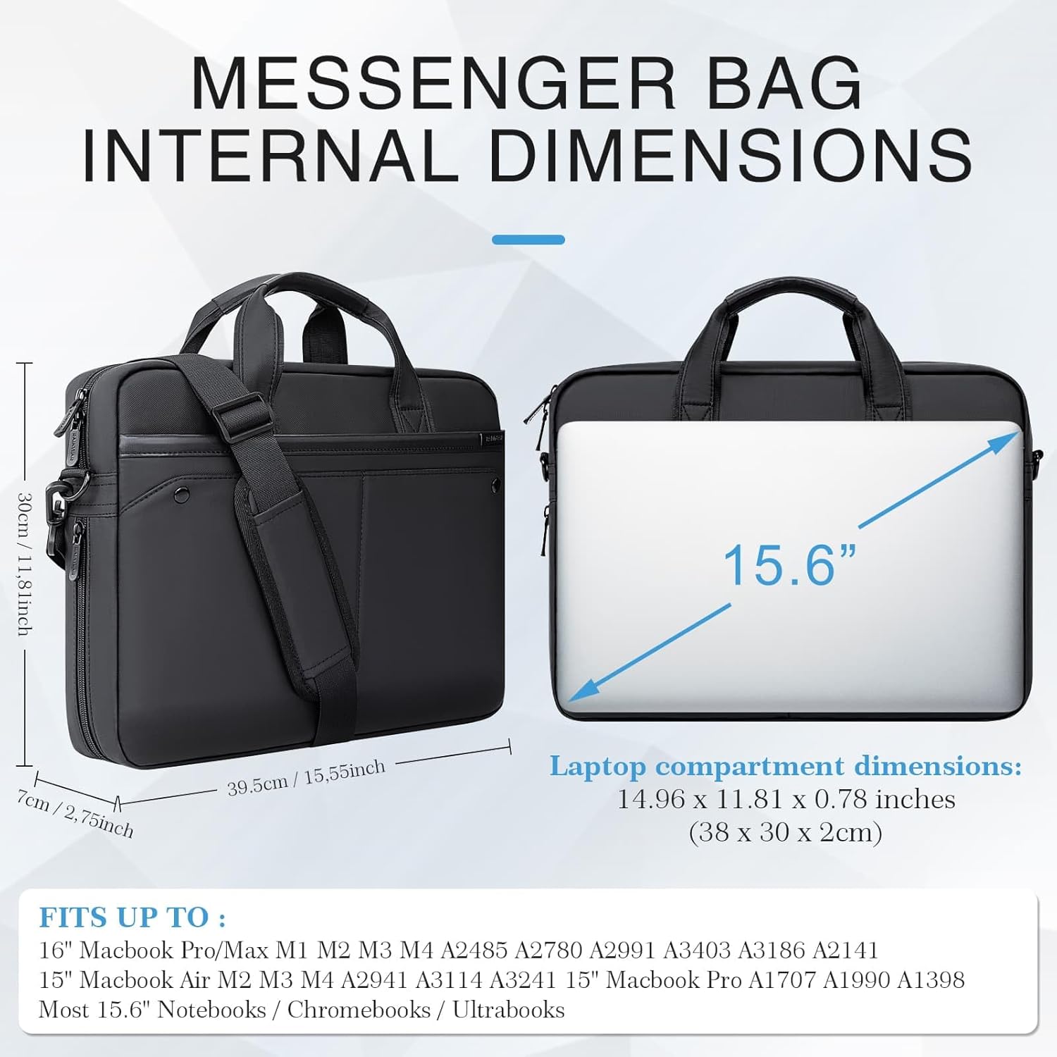 - Interal Dimensions: The laptop bag internal dimension: 15.55 x 11.81 x 2.75 inches, laptop compartment dimension: 14.96 x 11.81 x 0.79 inches, this laptop bag fits up to 15.6 inch laptop/MacBook/computer/PC. Please check your device dimensions against latop compartment dimensions to ensure perfect fit.