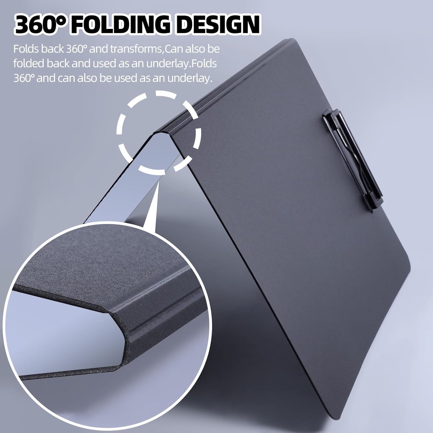 - Easy to use: This foldable clipboard can be folded 360 degrees without deformation; Horizontal and vertical two clips facilitate multi-angle use, 1.80 mm thick board provide a smooth writing experience; This clipboard with pen slot in the upper left corner; Rounded edges are sanded, won't hurt your hands