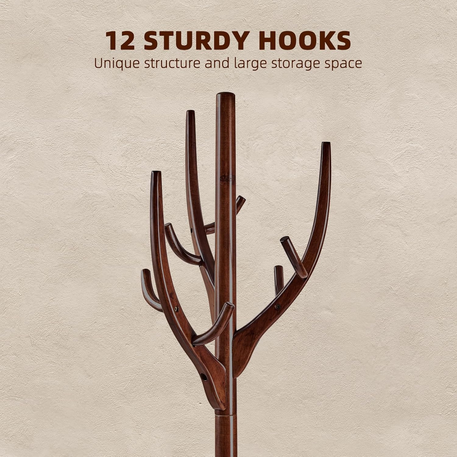 - 【CREATIVE AND STURDY】 The wood coat rack freestanding boasts 12 sturdy branches, each capable of holding 11 lbs, totaling a max capacity of 120 lbs. Its creative design combines beauty with functionality.