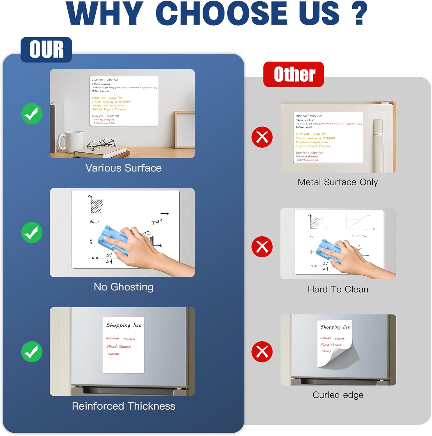 - 【Adhesive Dry Erase Stickers - No Magnets Needed!】 Peel-Stick Freedom: Securely adheres to tile, glass, wood, plastic & textured walls—no metal surfaces required! Ideal for rentals, classrooms, and curved cabinets where magnetic boards fail.