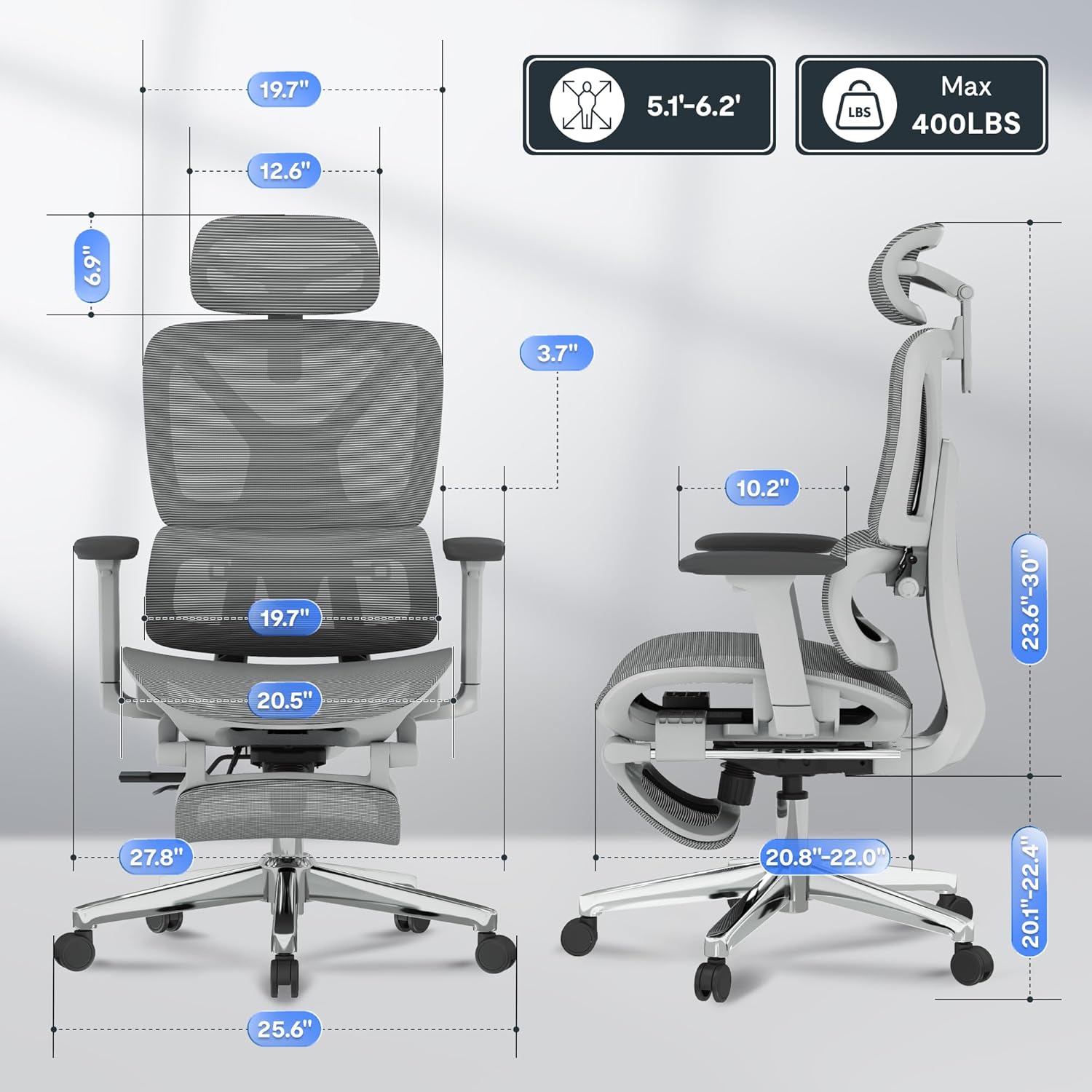 - Customizable Comfort: Featuring adjustable seat depth (17"-20"), height (20.1"-22.4"), and tilt functions to ensure a perfect fit for users between 5'1" and 6'2".
