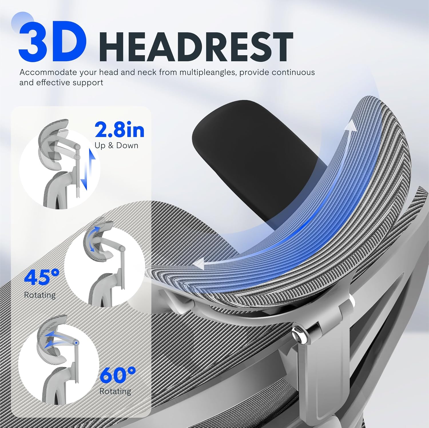 - Enhanced Ergonomics: Dynamic lumbar support, 5-level adjustable back, a 3D adjustable headrest, nap footrest and tilt provide superior back and neck support for long hours.