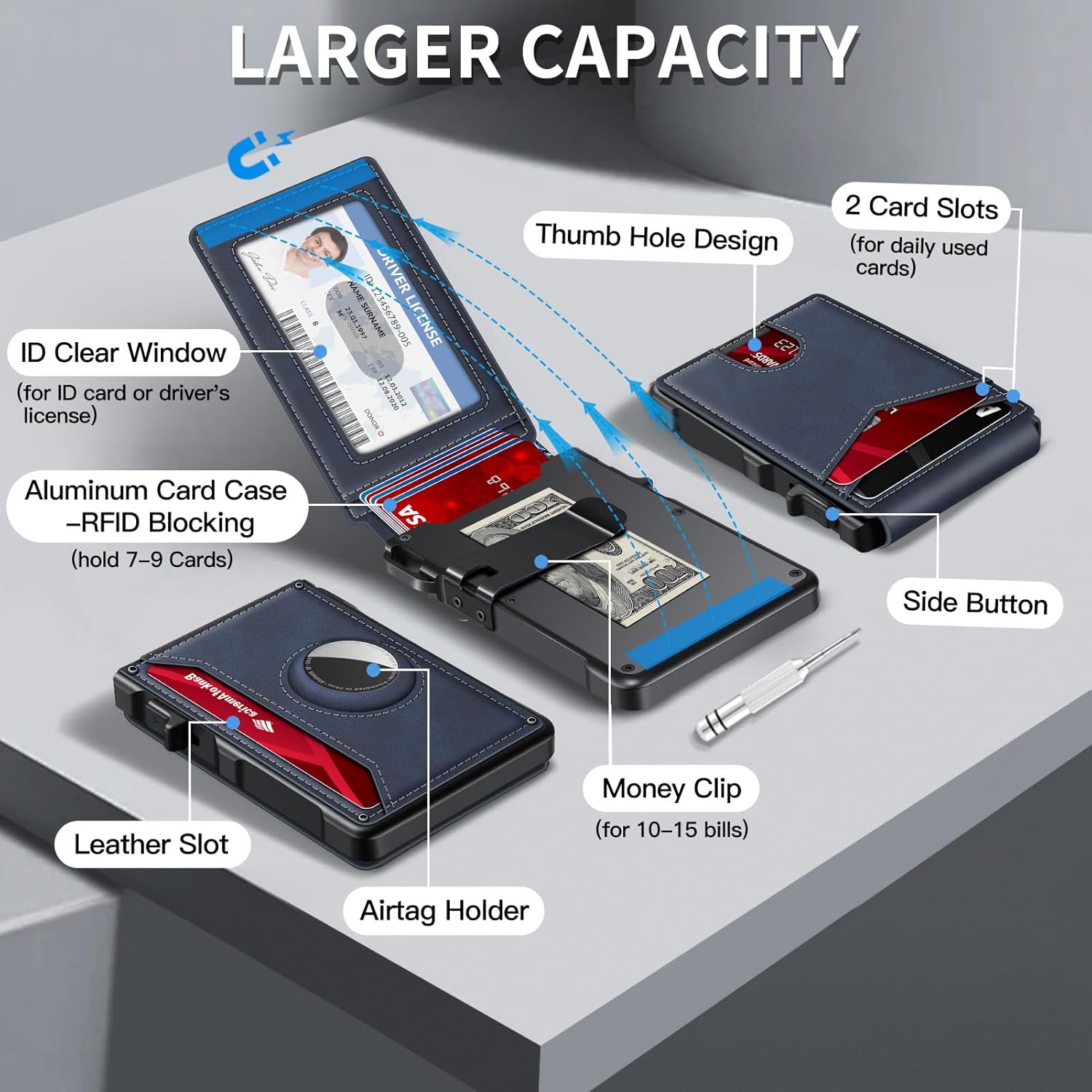 - MINIMALIST BUT LARGE CAPACITY - Our minimalist wallet for men with air tag holder fits effortlessly in pockets without bulk, yet holds 12+ cards, cash and AirTag securely. A money clip on the inside of the card holder helps you store cash(For the best magnetic effect, please DO NOT clip over 5 bills to the money click inside).