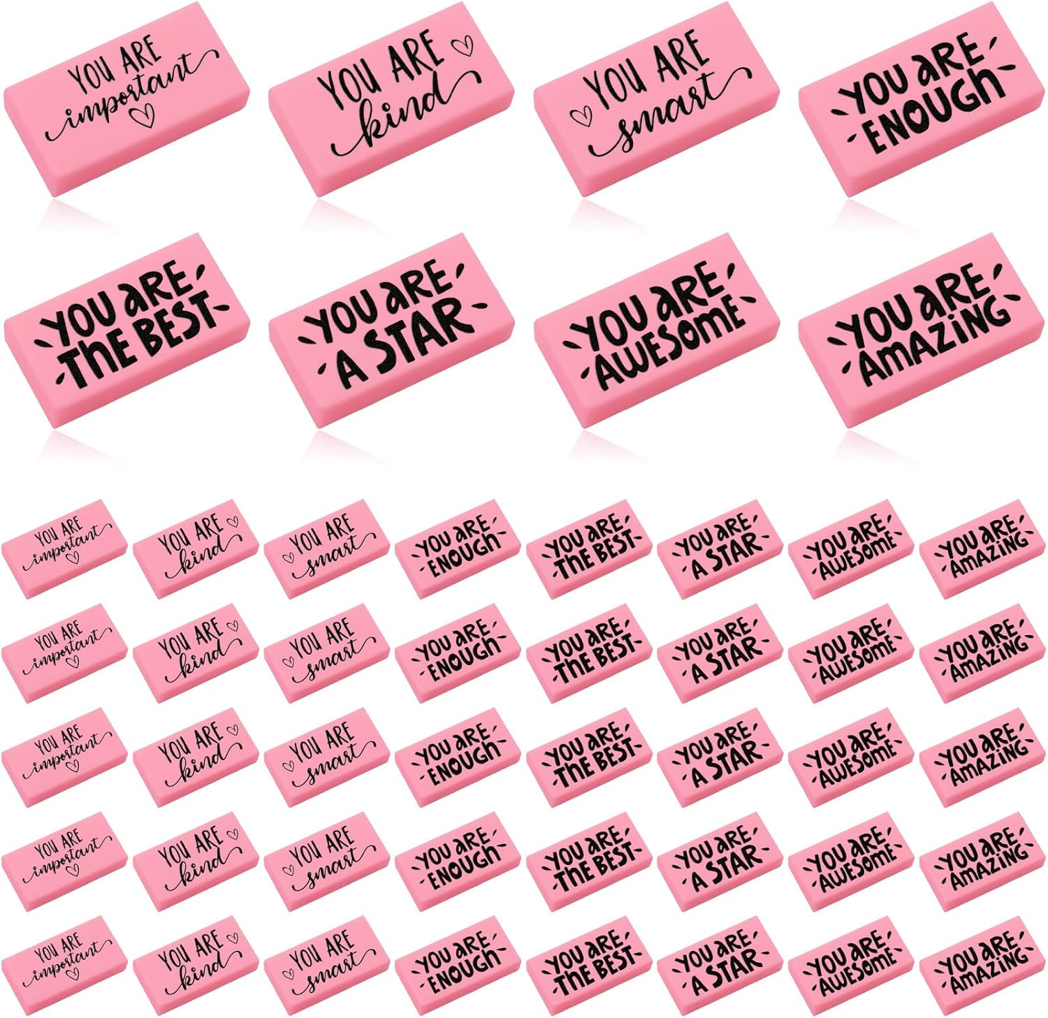 PerKoop 50 Pcs Pcs Inspirational Pink Erasers Bulk Small Motivational Block Pencil Erasers Back to School Gifts for Classroom Students Teachers Office Stationery Supplies
