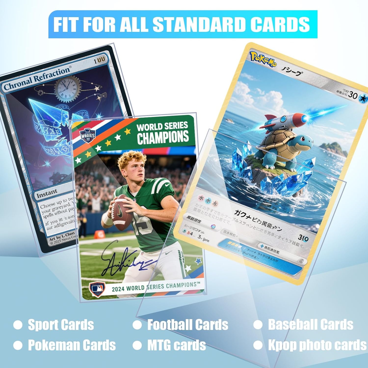 - Wide Applications: Suitable for all standard-size (2.5"x3.5")and smaller cards, including trading cards, football cards, rugby cards, basket ball cards, sports cards, game cards, MTG cards, TCG cards, business cards, idol photo cards, gift cards and more.