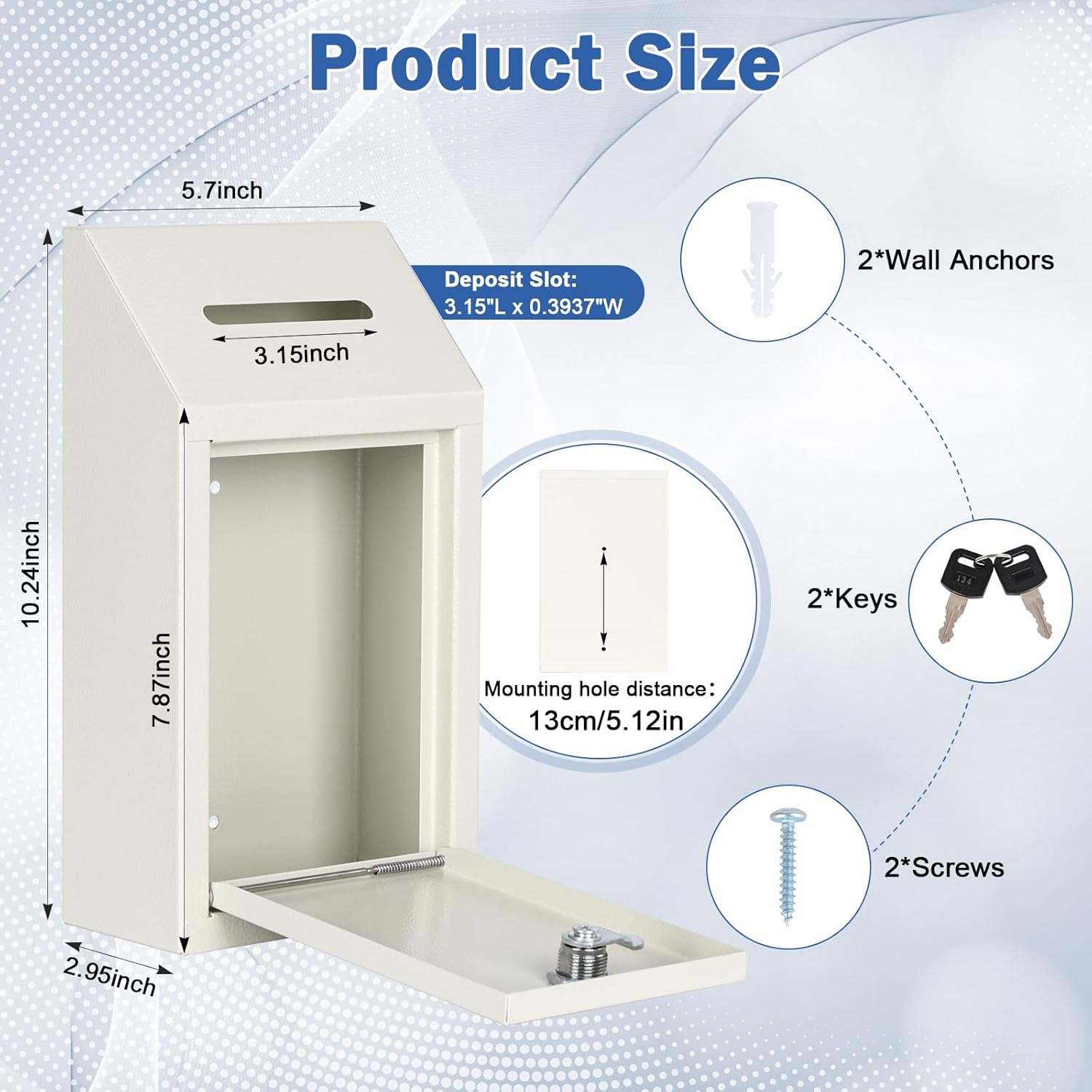 KYODOLED Money Cash Drop Box with Lock, Metal Donation and Suggestion Box with Slot Wall Mounted for Farm or Office, Home, Outdoor, White, 10.24 x 5.7 x 2.95 Inch