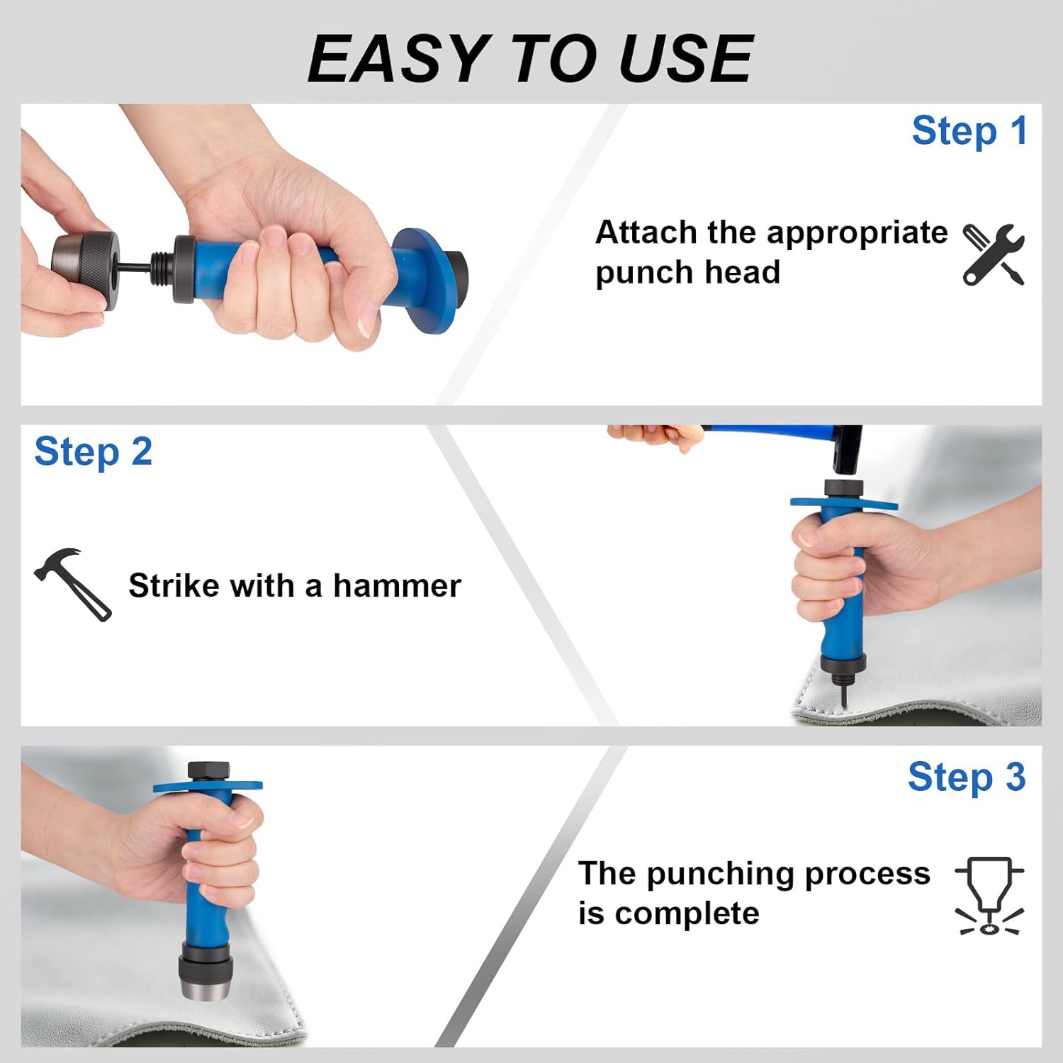 - Easy to Use:This single hole punch comes with interchangeable punch heads that feature a knurled surface, allowing them to be easily screwed into the six-inch-long steel handle. This design ensures a secure and safe grip, making it convenient for punching holes, working with your grommet tool kit, or even using it as a belt hole puncher