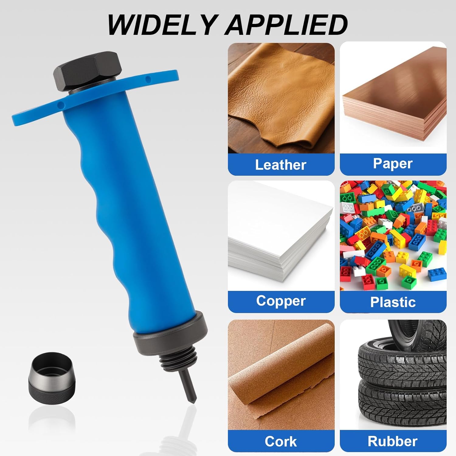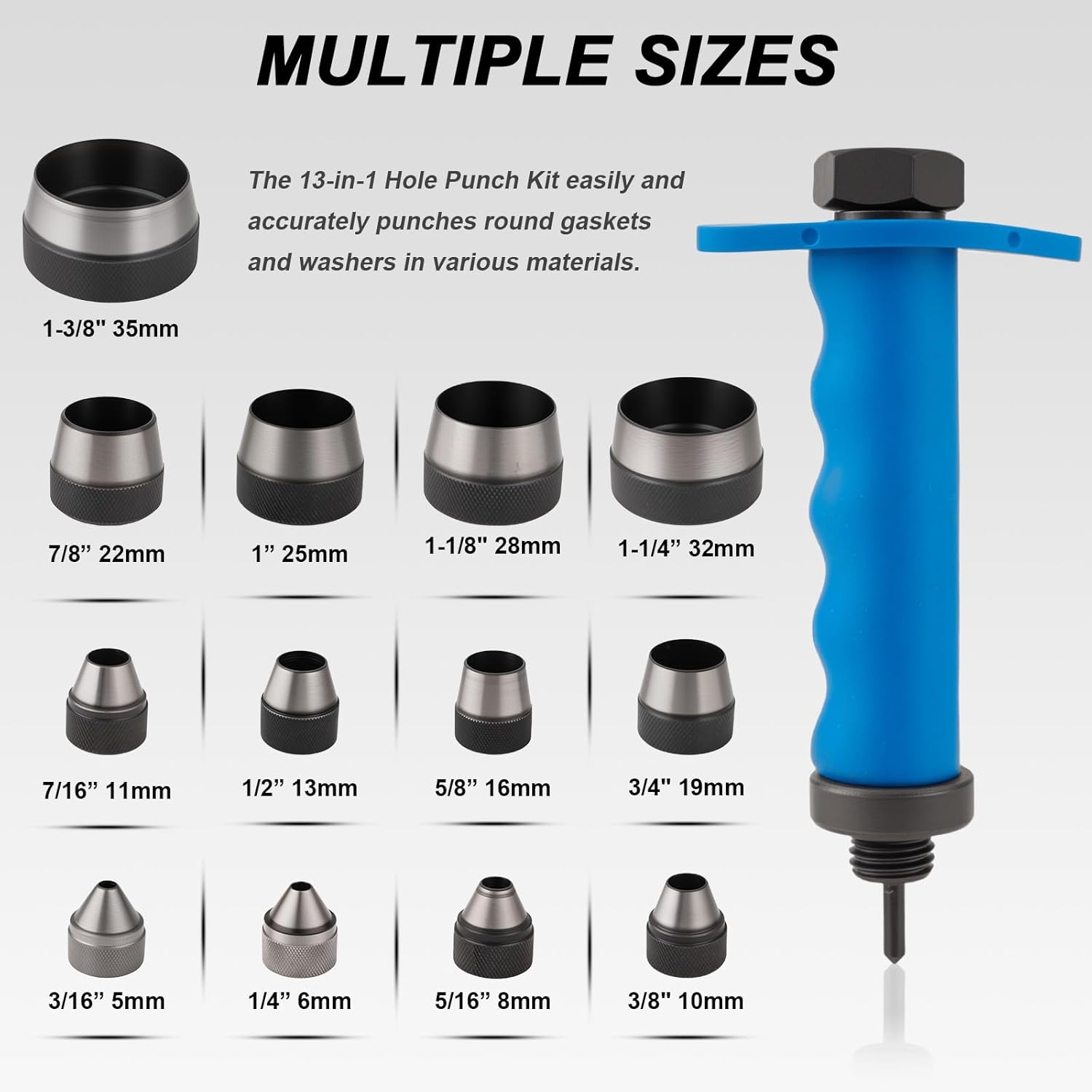 - Leather Hole Punch:With the 13-in-1 Hole Punch Kit, you can easily and accurately punch round gaskets and washers in various materials like leather, copper, plastic, rubber, paper, cork, and more. This kit eliminates the guesswork by creating clean and precise holes from 3/16-inch to 1-3/8-inch (5-35mm) in diameter, even in materials that are difficult to cut with scissors or knives