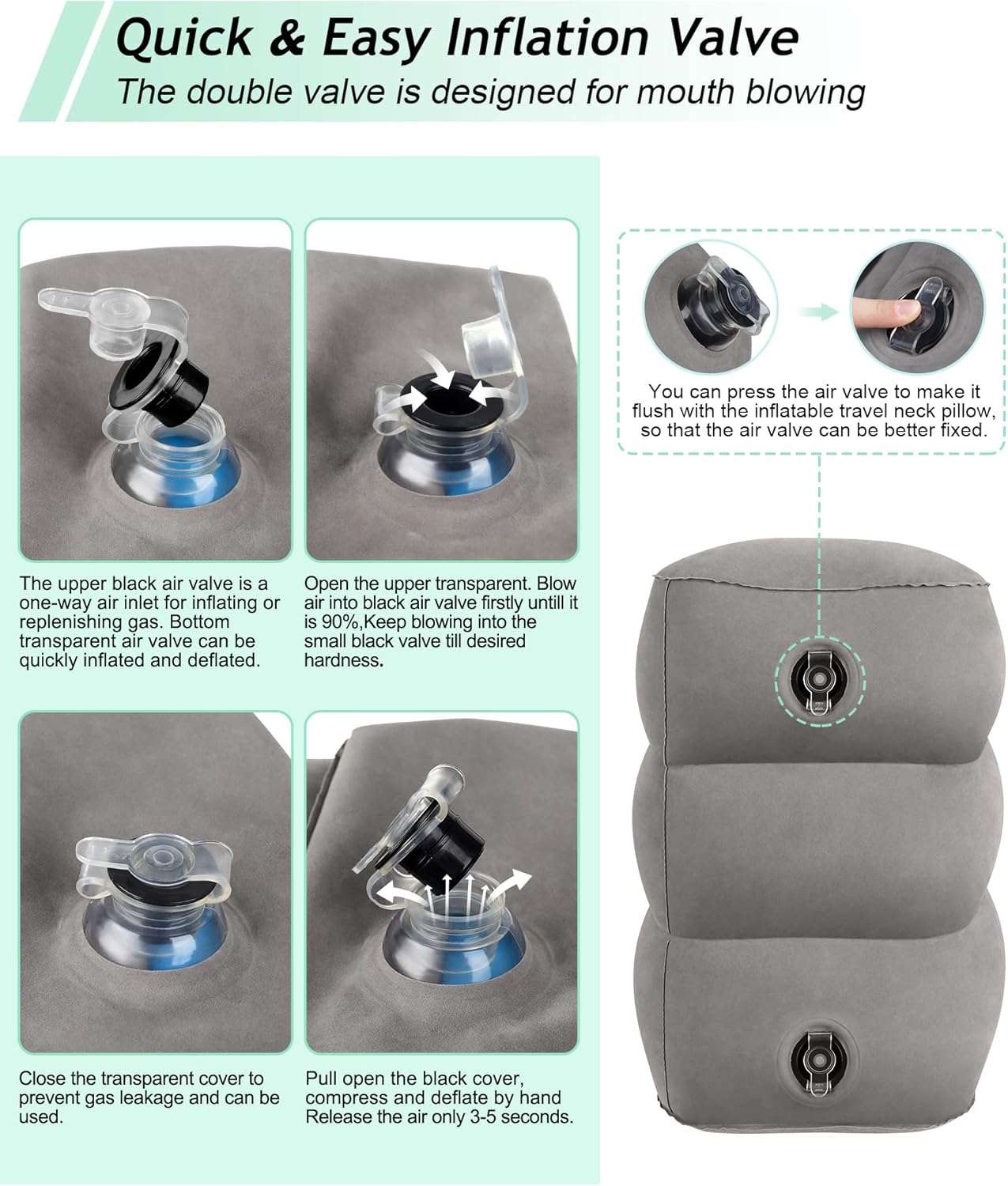 - FAST INFLATION & DEFLATION: The airplane footrest has a 2 in 1 dual valve design,the upper black air valve is a one way air inlet for inflating or replenishing gas. Bottom transparent air valve can be quickly inflated and deflated. What's more, the double valve is designed for mouth blowing, It only takes about one or half minutes with a few breathes. Release the air only 3 or 5 seconds.