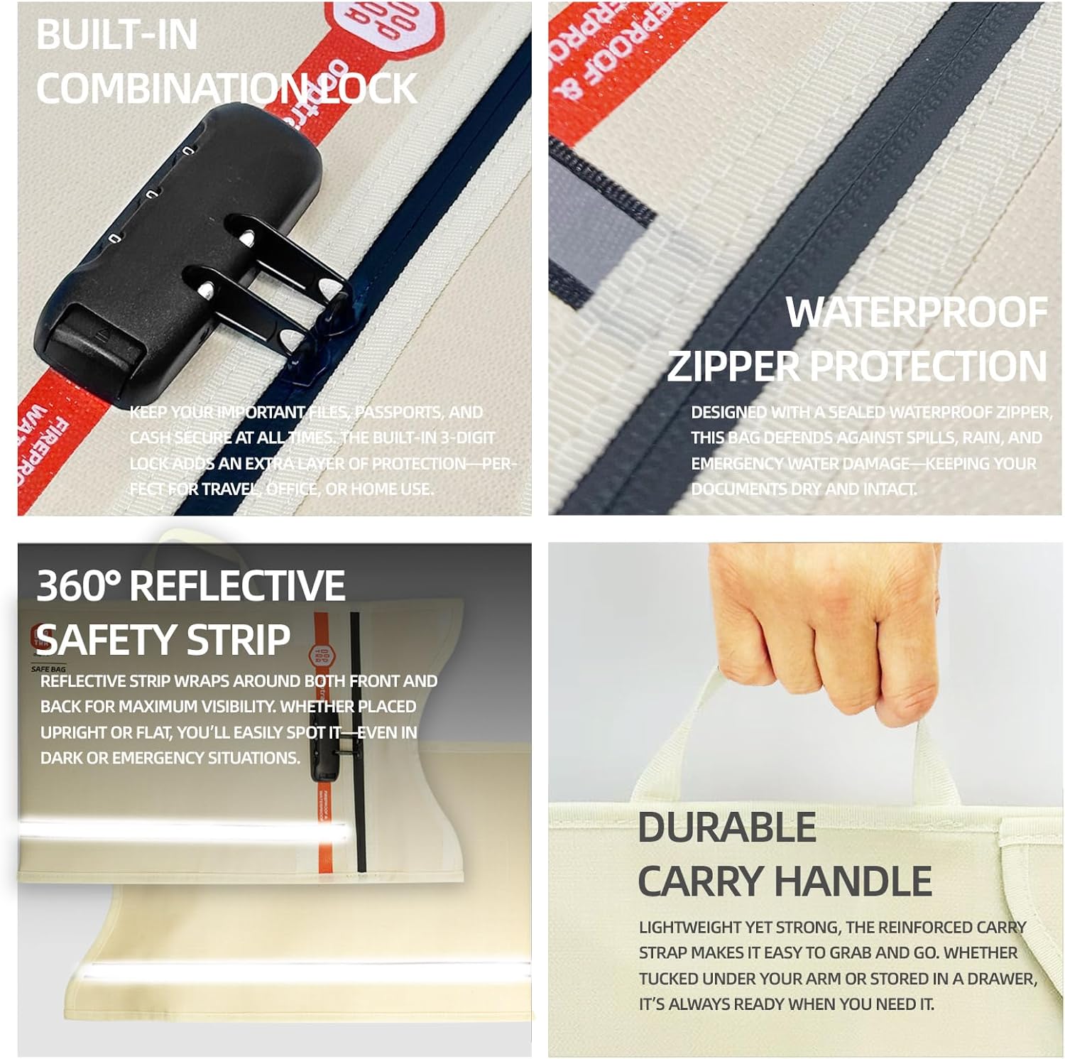 - 【Advanced 11-Layer Fireproof, Waterproof & Reflective Design】 Built with a new 11-layer fire-resistant structure and silicone-coated fiberglass, each bag offers enhanced protection—resisting heat up to 4200°F (short-term) while keeping out water, moisture, and smoke. The waterproof zipper further seals your valuables, and a full-length reflective strip ensures visibility in low light or emergencies.