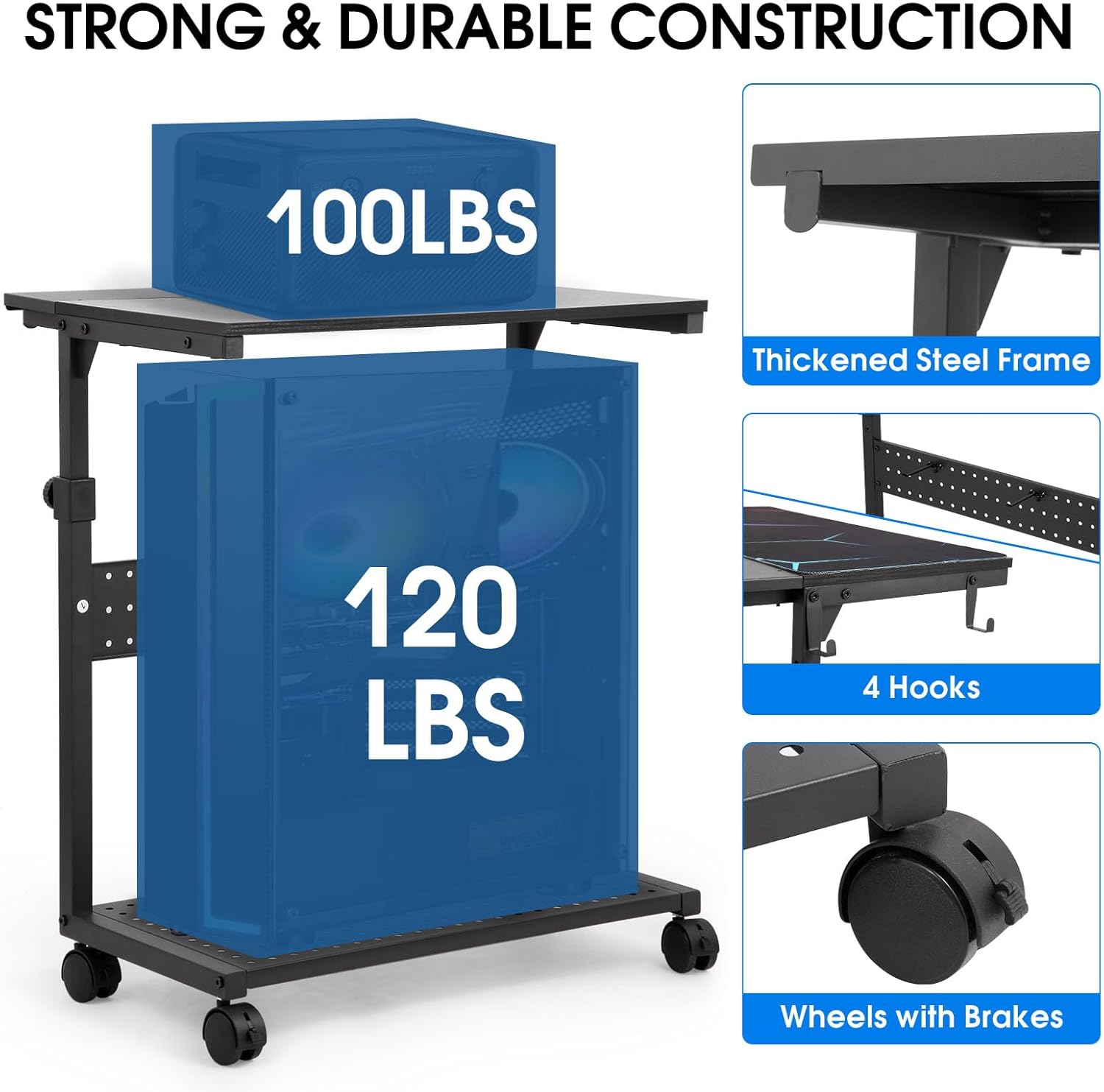 - STURDY CONSTRUCTION: This PC stand is made of solid wood panels and a thickened steel frame, with high-quality scratch and corrosion resistance, ensuring stability and durability, not easily scratched or deformed. Weight capacity tested to withstand 100 pounds (top) to 120 pounds (bottom), ensuring the long-term safety of your precious computer.