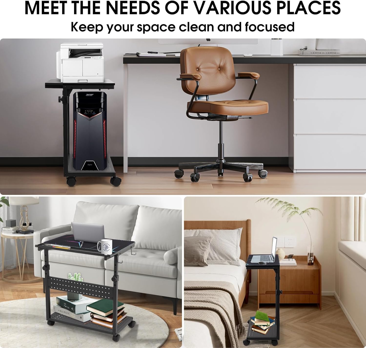 - STRONG MOBILITY: Equipped with four 360° rotating silent wheels, the computer stands cart moves smoothly and easily without scratching the floor, allowing you to move it anywhere. Easy to place, the wheels can be locked to keep your computer tower stationary when needed. Expanded Space-Saving Design: