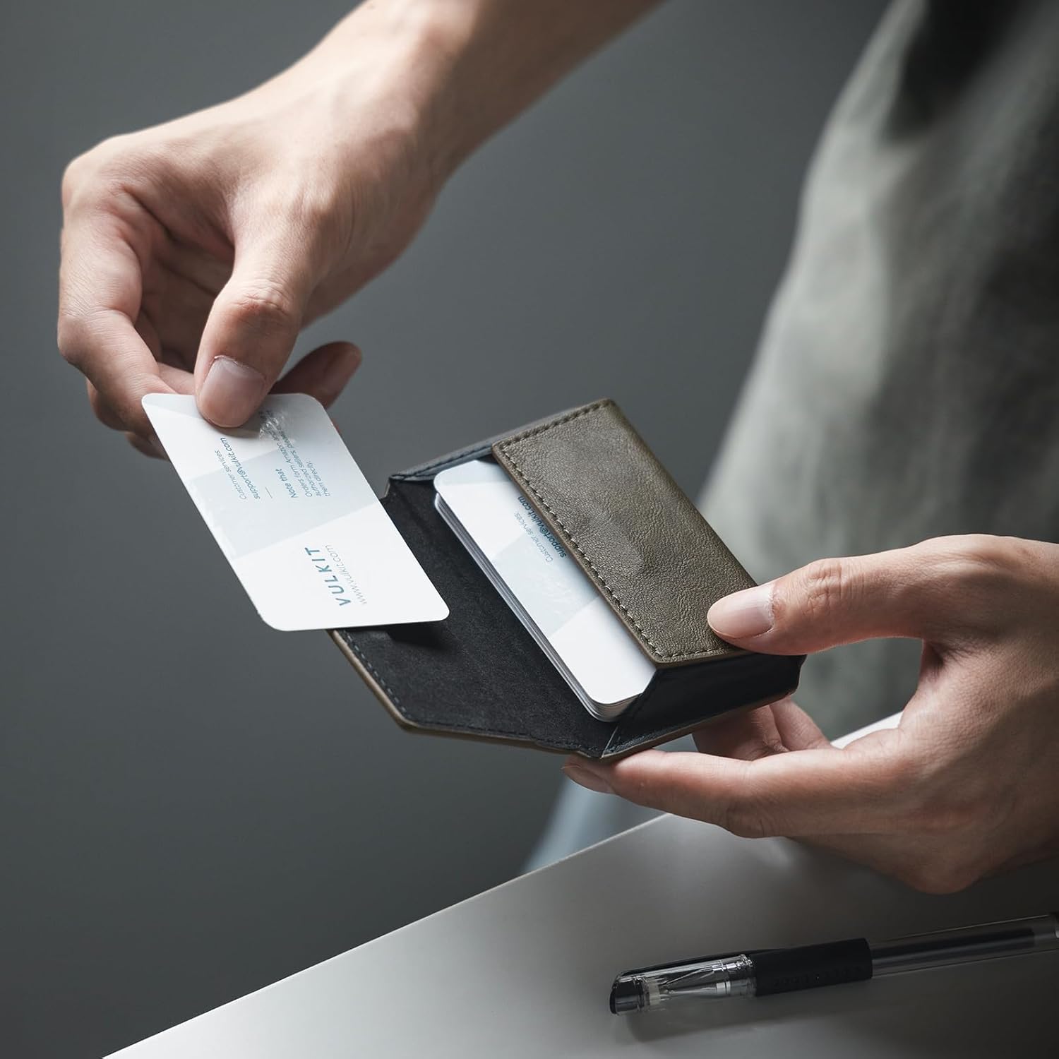 VULKIT Leather Business Card Holder Case for Men Slim Pocket Business Card Wallet Name Card Case Holder, Holds 20 Business Cards Olive