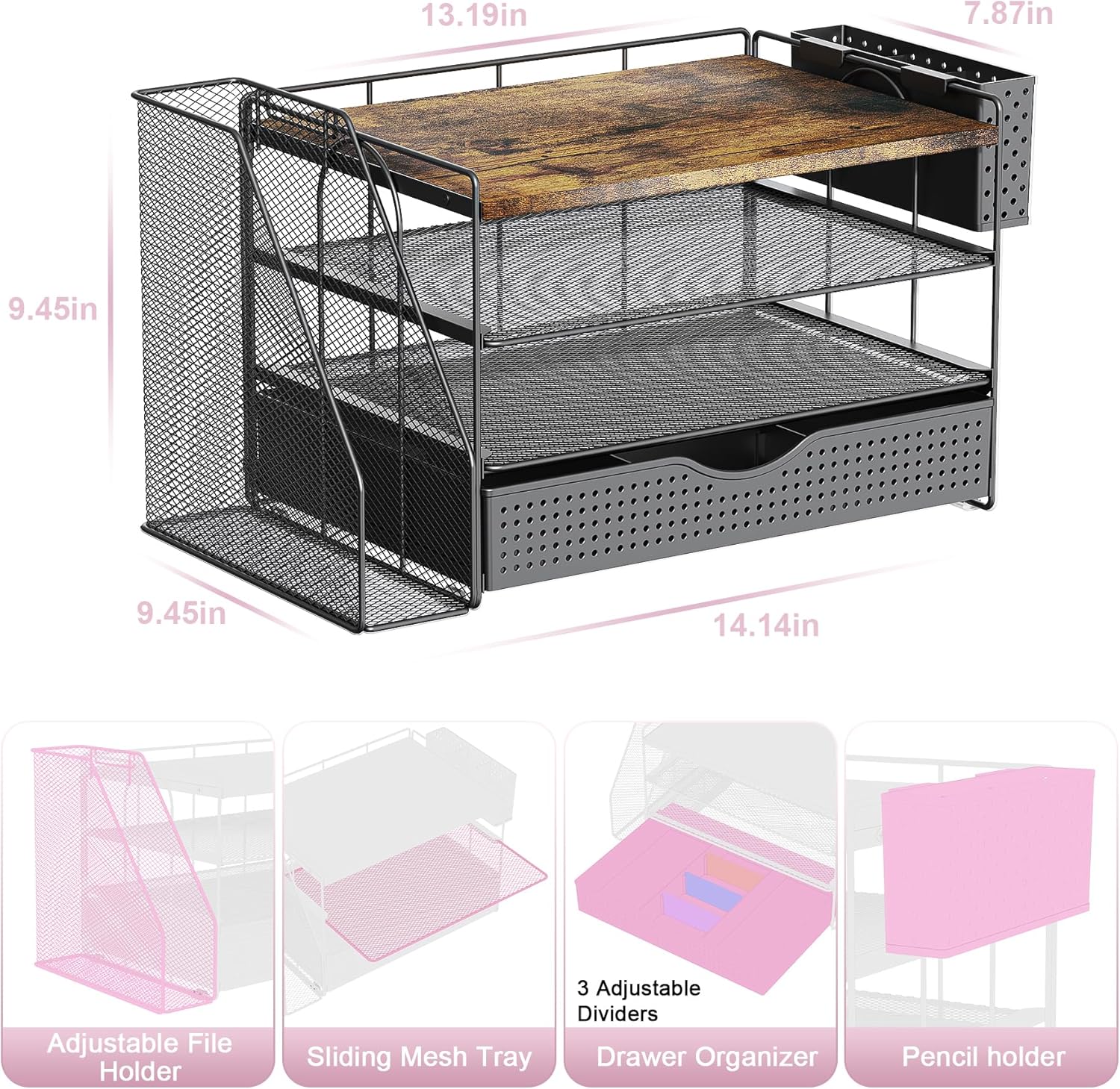 Wood Desk Organizers and Accessories with File Holder, 4-Tier Desk Accessories & Workspace Organizers with Drawer and Pen Holder, Paper Organizer for Office Supplies (Wood)