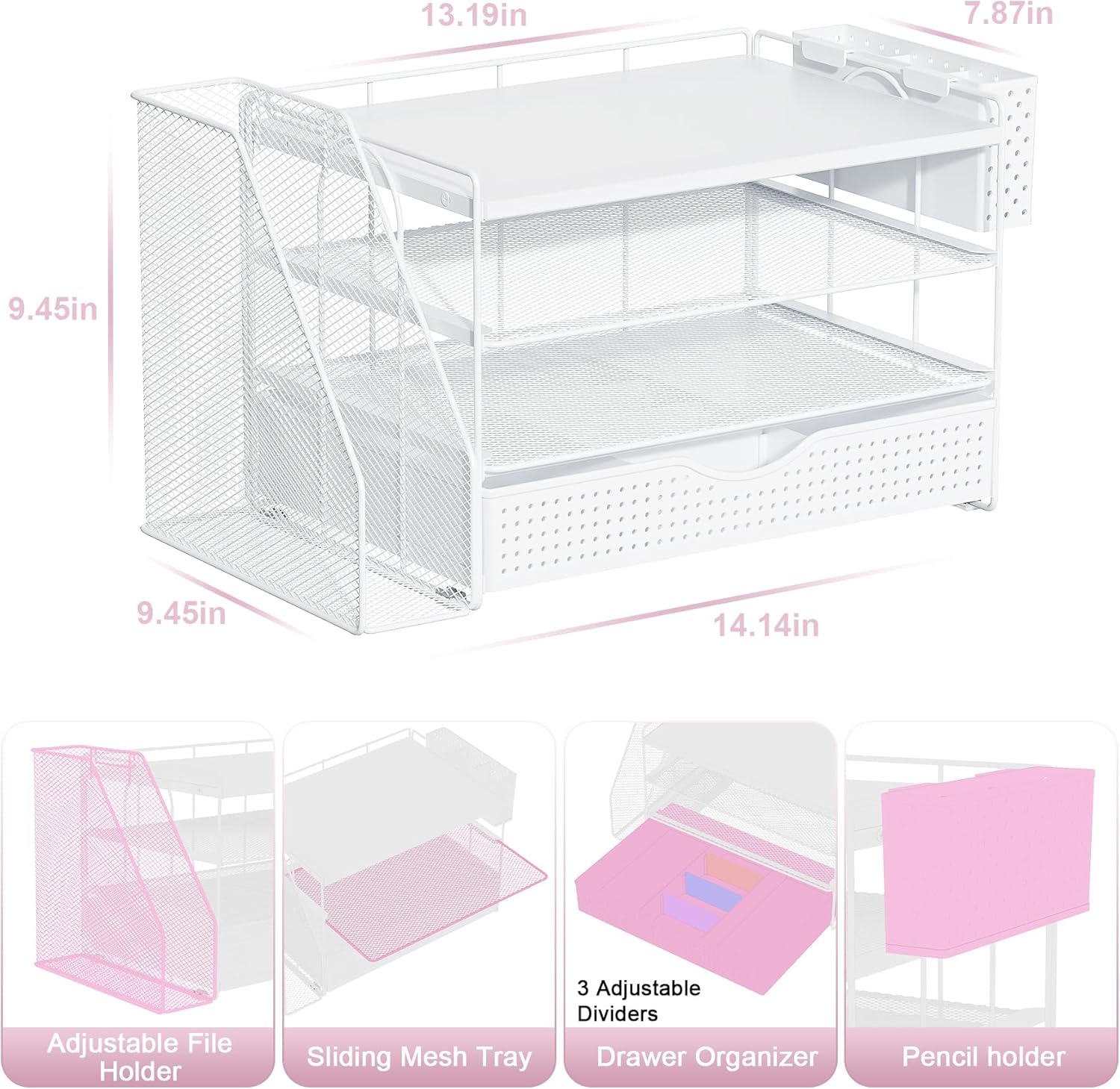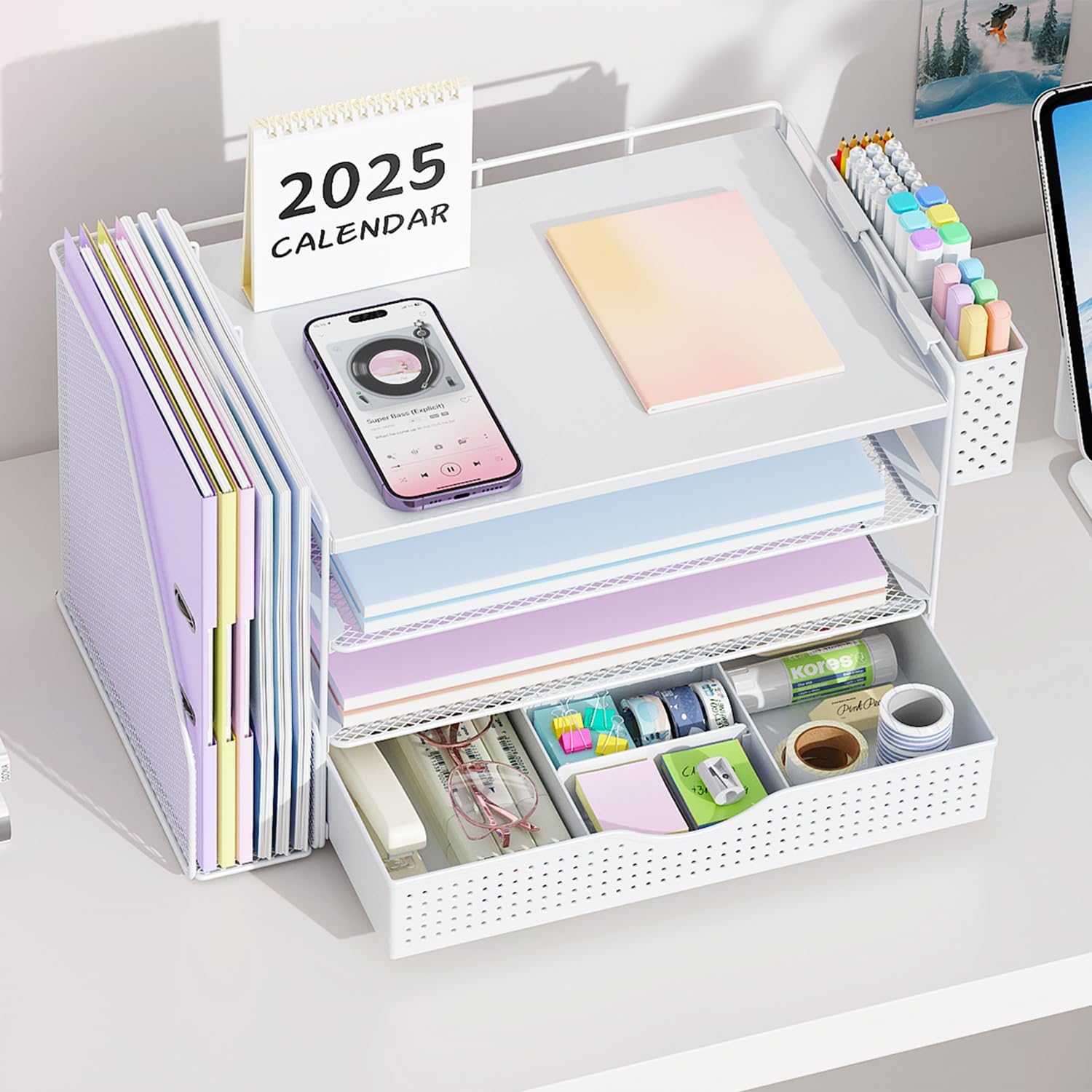 Wood Desk Organizers and Accessories with File Holder, 4-Tier Desk Accessories & Workspace Organizers with Drawer and Pen Holder, Paper Organizer for Office Supplies (White)