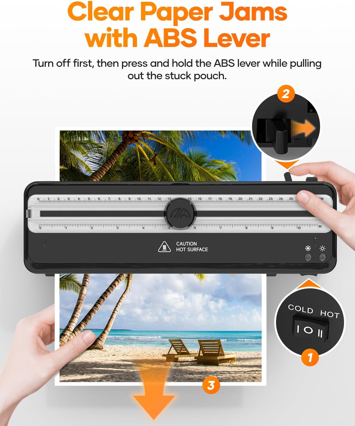 - Jam-Free System with ABS Button & Auto Shut-Off Equipped with a one-touch ABS button to release jammed paper quickly and safely. The built-in overheat protection automatically shuts off the machine to prevent damage and extend lifespan.
