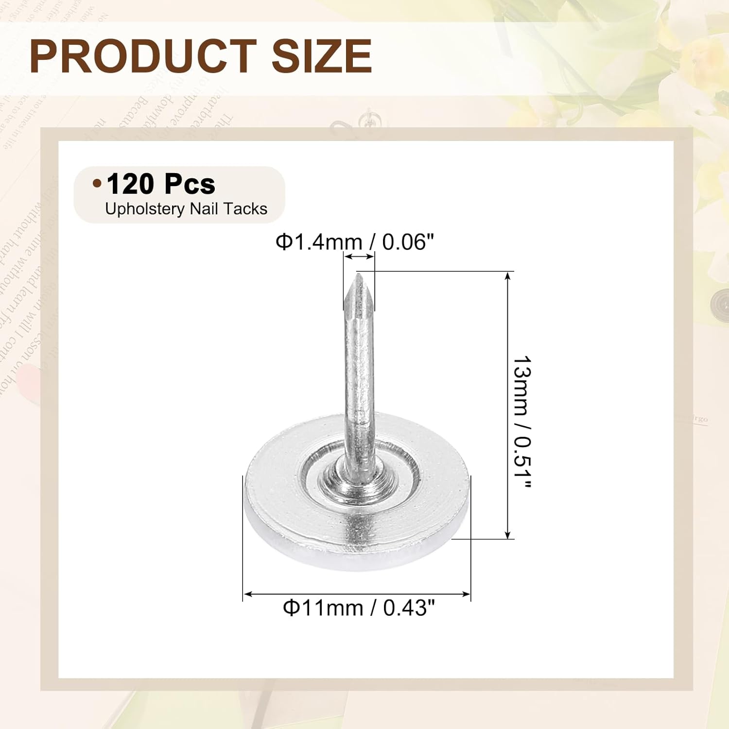 - [Size & Quantity] - The package comes with 120pcs decorative upholstery tacks. Sufficient quantity to meet your different daily needs. The overall size of upholstery nails is about 11mm x 17mm/0.43-inch x 0.67-inch(D*H)