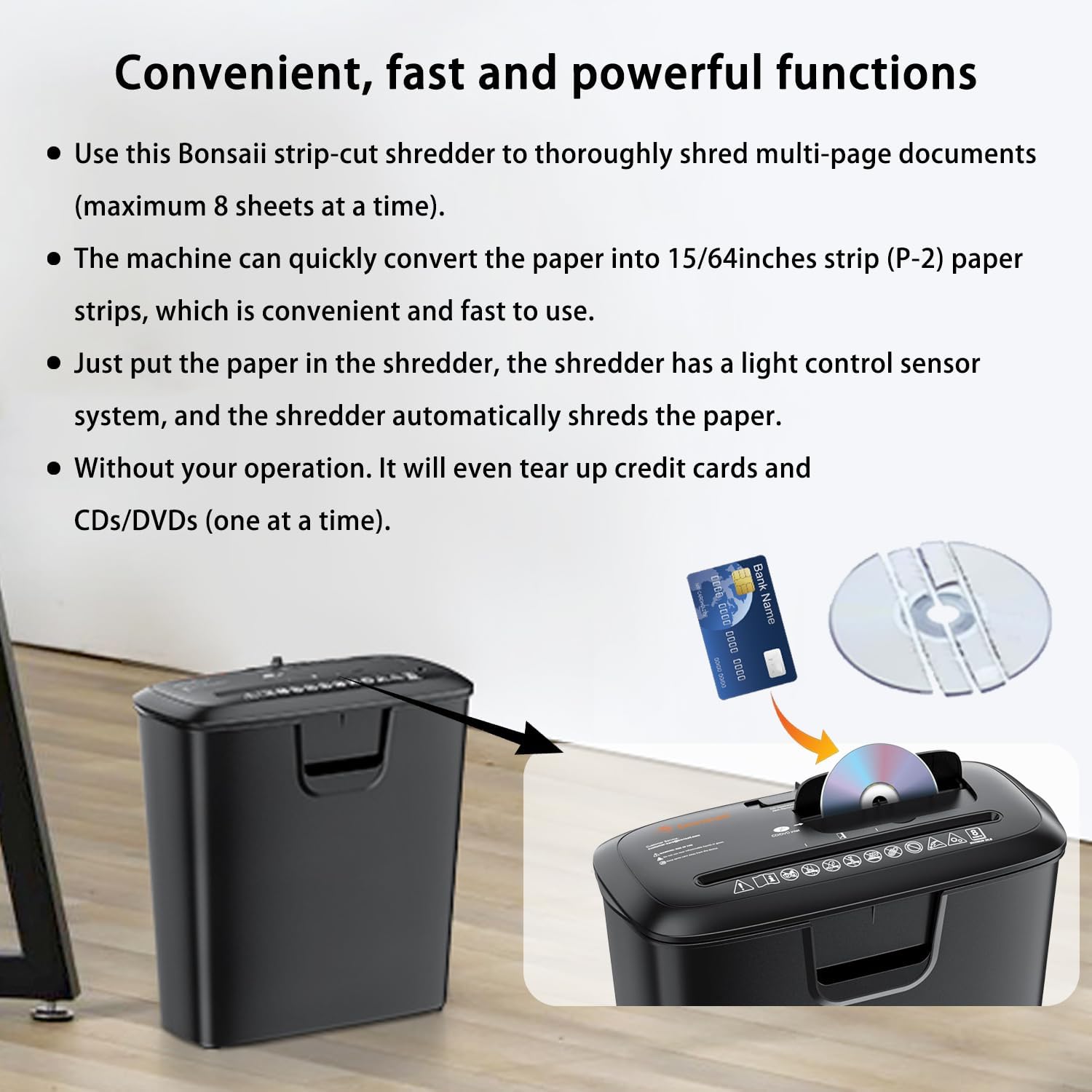 Bonsaii 8-Sheet Strip-Cut Shredder for Home – Compact Home Office Paper Shredder with Overheat Protection, Capable of Shredding CDs and Credit Cards, Includes a 3.4-Gallon Waste Bin