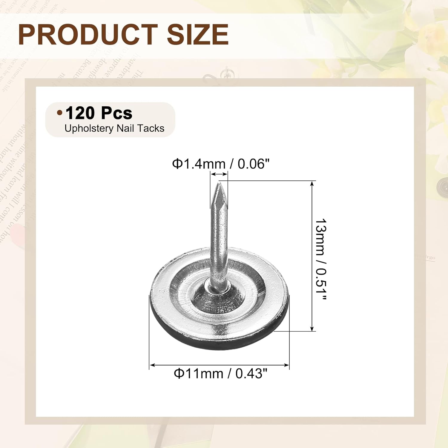 - [Size & Quantity] - The package comes with 120pcs decorative upholstery tacks. Sufficient quantity to meet your different daily needs. The overall size of upholstery nails is about 11mm x 13mm/0.43-inch x 0.51-inch(D*H)