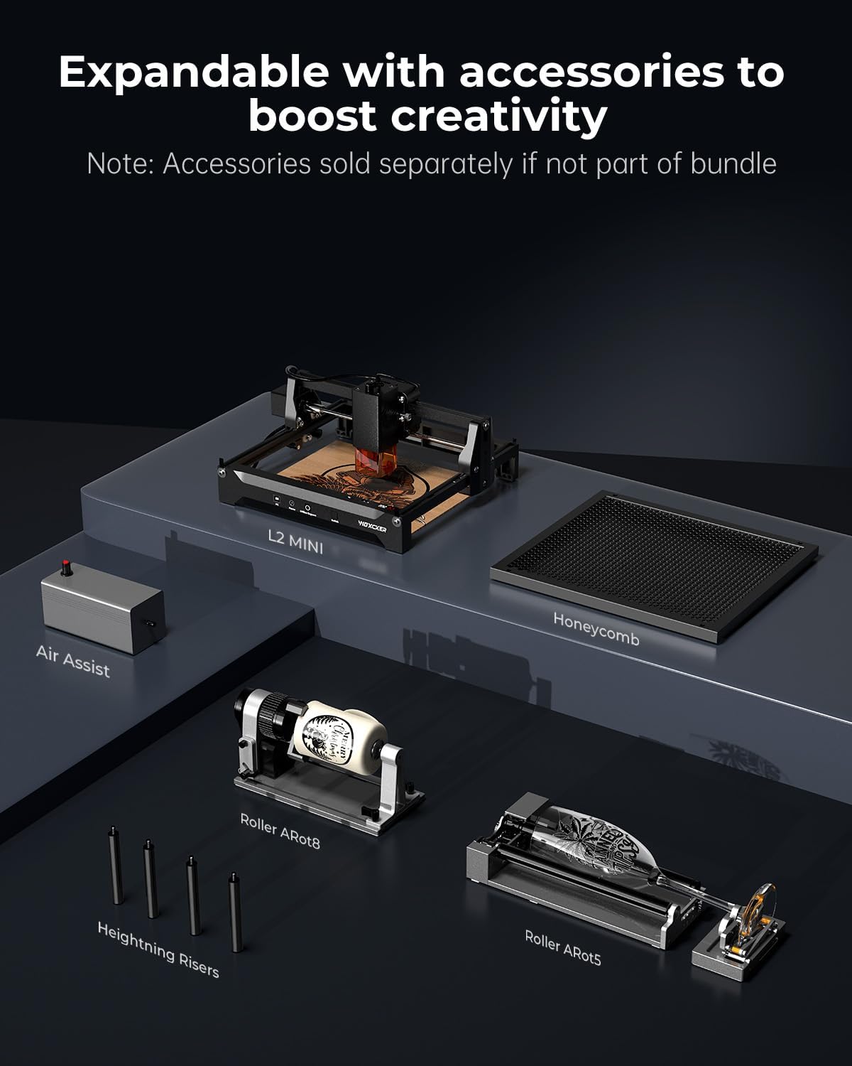 - Modular System – Expand Your Way: The true power of L2 Mini/Flex lies in its highly expandable modular system: Supports 1064nm 1W / 5W / 10W laser heads for engraving and cutting at different power levels. Compatible with rotary modules (up to 100mm diameter) for tumblers, mugs, and cylindrical objects. Add riser bases and extension rails for taller or larger-format projects. Easily expand with air assist, air purifiers, honeycomb beds, protective covers, and more