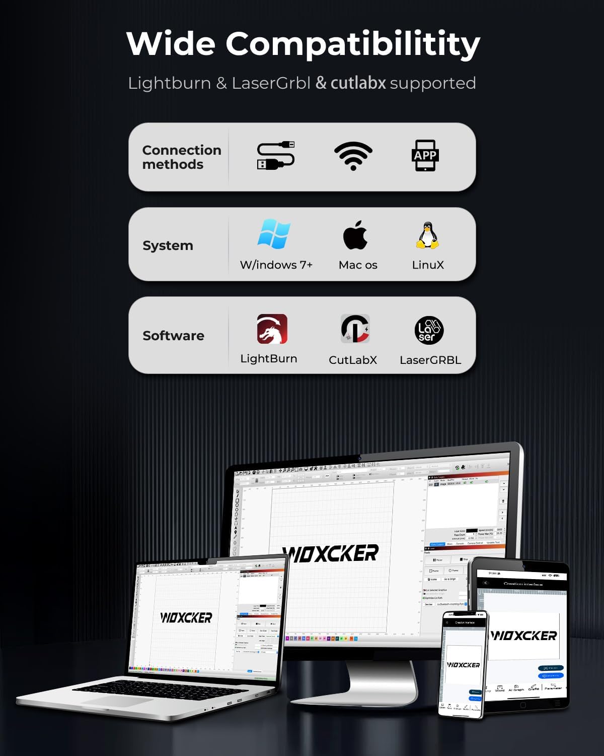 - Smart Software Compatibility: Works seamlessly with LightBurn, LaserGRBL, and CutLabX, supporting Windows, macOS, Android, and iOS systems. Accepts a variety of file formats, including JPG, PNG, BMP, SVG, DXF, and AI—ensuring creative flexibility.