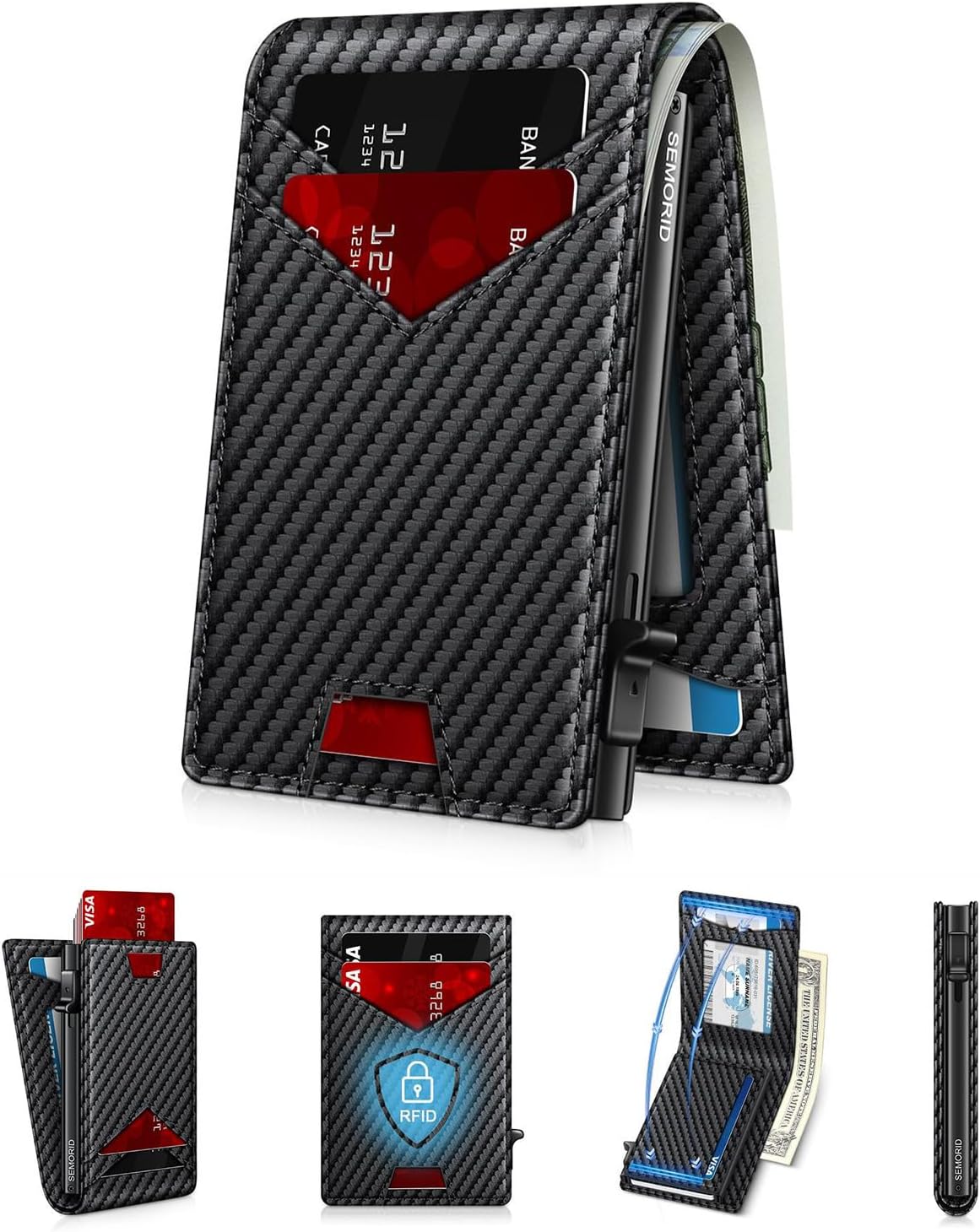 - QUICK & EASY CARD ACCESS: SEMORID slim wallet for men features a pop-up card holder design. With a simple press of the button on the side of the metal case, the cards pop out in a tiered layout, making it easy and quick to access them.